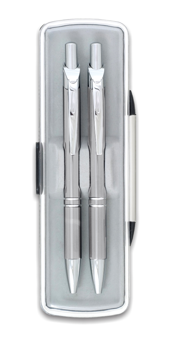 Komplet PenMate długopis + ołówek Lux. Komplet składający się z długopisu i ołówka automatycznego. Długopis z wymiennym wkładem. Ołówek automatyczny 0,7 mm z chowaną końcówką. Korpus ołówka i długopisu wykonany z aluminium, pozostałe części metalowe chromowane.