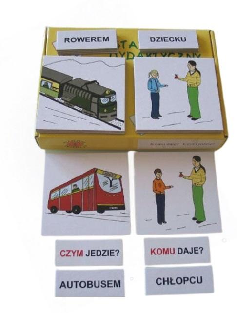 Zestaw plakietek i etykietek służy do przenoszenia obrazów z rzeczywistości na obrazki, uswiadamianiu dziecku, że słowo (napis) oznacza konkretną rzecz, czynność czy sytuację oraz do nauki czytania. Uczy dziecko rozumienia pytań oraz udzielania odpowiedzi.Zestaw ten składa się z dwóch oddzielnych zestawów ćwiczeniowych: Komu daje? i Czym jedzie?Zestaw (Komu daje?) służy do nauki zmiany końcówek rzeczownika w liczbie pojedynczej, która wymusza pytanie: Komu?, odpowiedzi na pytanie: Komu daje?Zestaw (Czym jedzie?) służy do nauki zmiany końcówek rzeczownika w liczbie pojedynczej, którą wymusza pytanie: Czym?, nauki odpowiedzi na to pytanie, oraz do nauki czytania zdań dwuwyrazowych: Jedzie.......(Czym?)