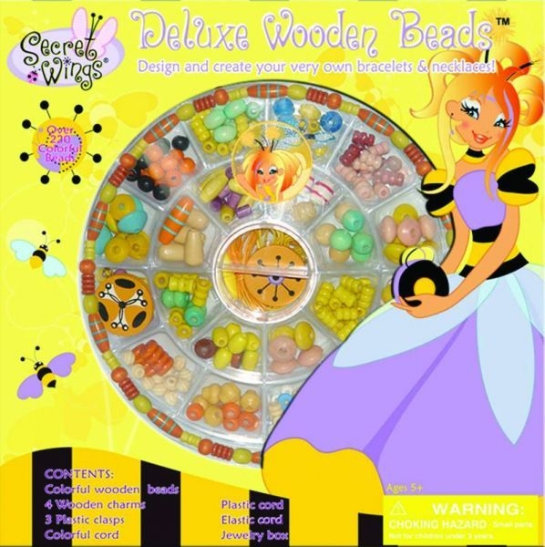 Deluxe Wooden Beads to olbrzymi zestaw kolorowych drewnianych koralików i ozdób wraz z akcesoriami w plastikowej szkatułce. Należy on do serii Secret Wings, która robi furorę wśród dzieci na całym świecie, z powodu postaci pięciu wróżek: Tansy, Poppy, Ivy, Honey i Lily.