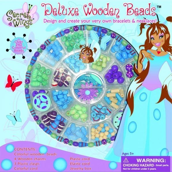 Deluxe Wooden Beads to olbrzymi zestaw kolorowych drewnianych koralików i ozdób wraz z akcesoriami w plastikowej szkatułce. Należy on do serii Secret Wings, która robi furorę wśród dzieci na całym świecie, z powodu postaci pięciu wróżek: Tansy, Poppy, Ivy, Honey i Lily.