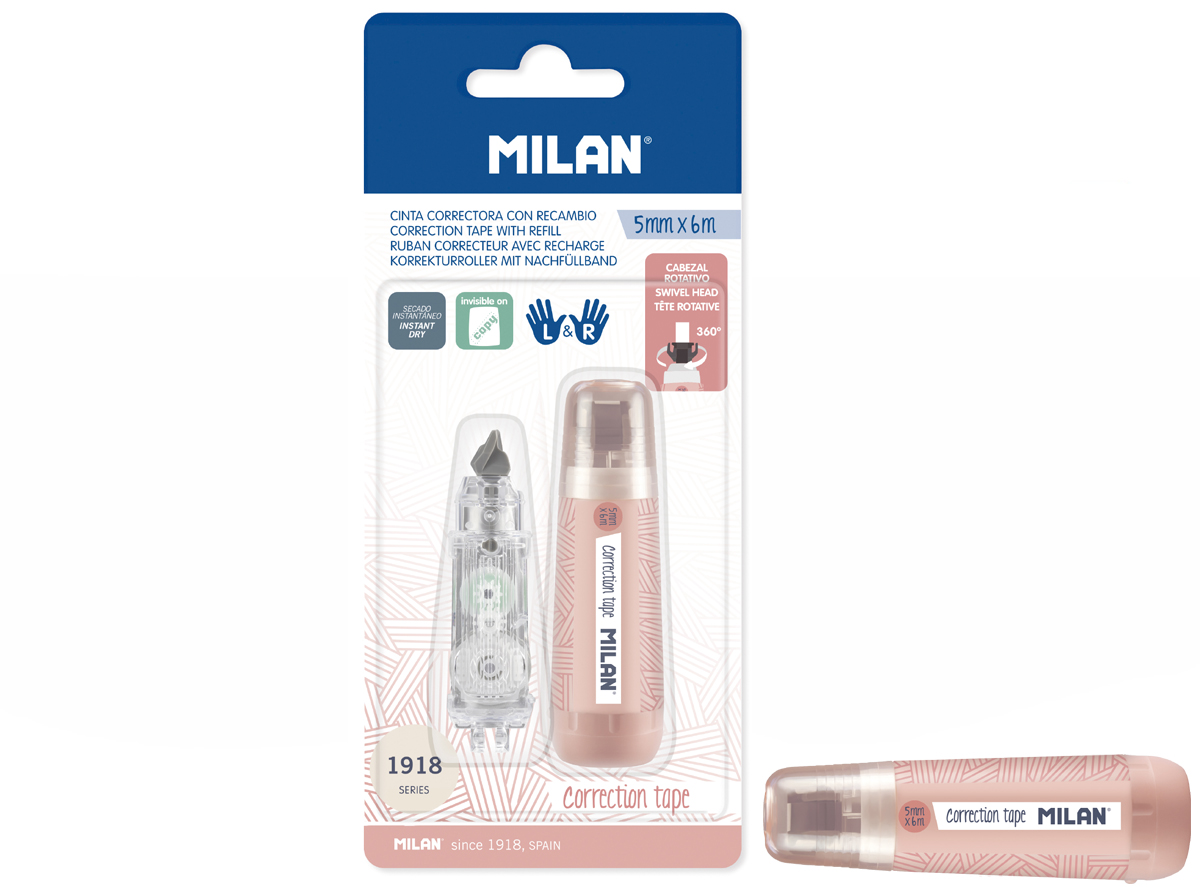 Opis produktuZasady bezpieczeństwaCylindryczna taśma korekcyjna z serii 1918 w kolorze różowym. Odpowiedni dla osób leworęcznych dzięki obrotowi końcówki o 360 stopni. Szybko, czysto i precyzyjnie. Korekty na wszystkich rodzajach papieru, nie pozostawia śladów na kserokopii lub faksie. 5 mm szerokości x 6 m długości. W zestawie wkład taśmy. Seria 1918 jest inspirowana oryginalnymi kolorami i wzornictwem gumek MILAN. x