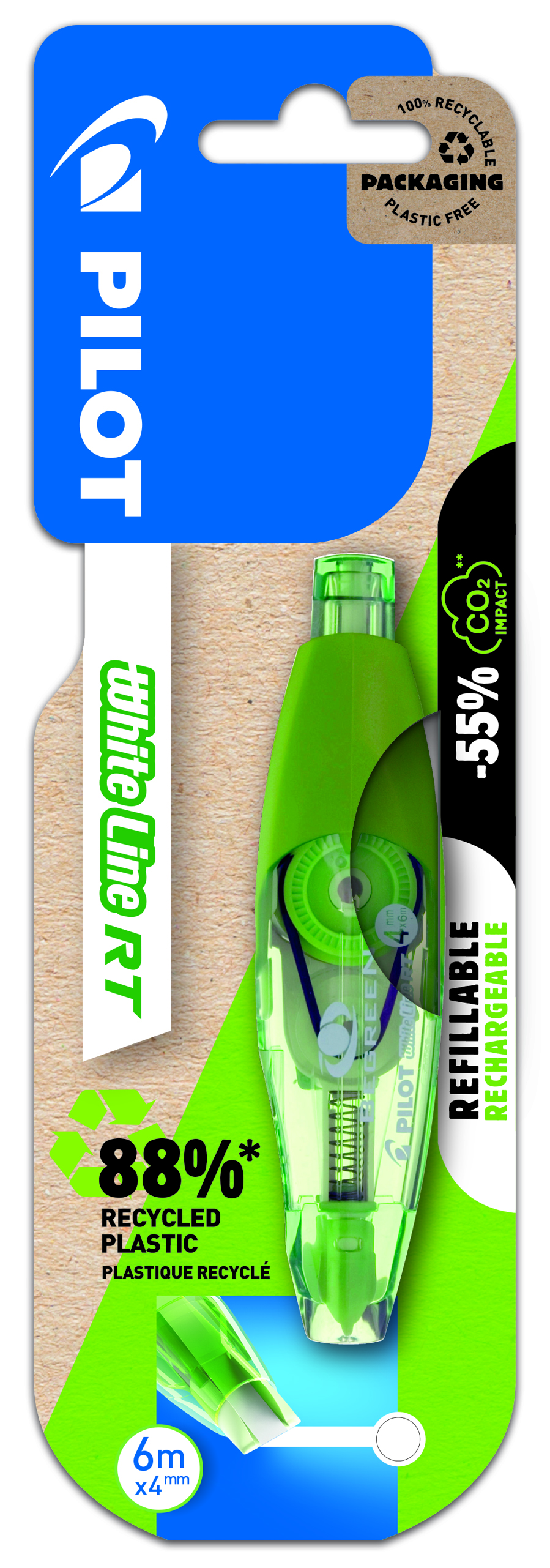 Automatyczny korektor w taśmie na blistrze. Wysokiej jakości korektor w taśmie w ergonomicznej obudowie, z wymiennym wkładem. Przezroczysta obudowa pozwala na kontrolę zużycia taśmy. Długość taśmy 6m, szerokość 4.2 mm. Ruchomy mechanizm zabezpieczający chroni taśmę przed zabrudzeniem i uszkodzeniami. Produkt ekologiczny, wykonany z materiałów przetworzonych w 88,4% nie wliczając części wymiennych.
