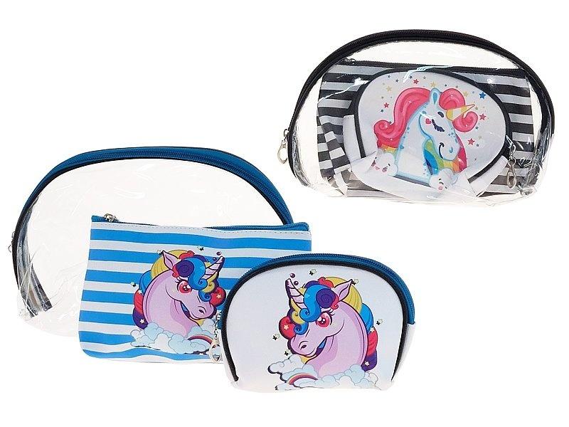 Opis produktuZasady bezpieczeństwaZestaw 3 kosmetyczek z jednorożcem - 25x15x9, 21x11x4, 16x10x4cm, zapinane zamkiem; PPB. . MIX wzorów - wysyłka losowa. x