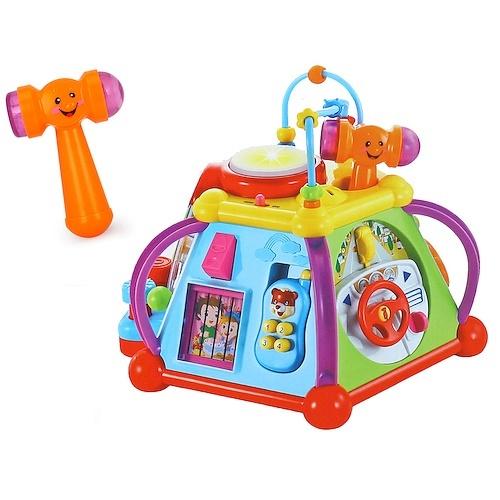 Opis produktuZasady bezpieczeństwaKostka aktywizująca 15 zabaw. Kolory poszczególnych elementów mogą się różnić. Zabawka posiada ponad 15 zabaw edukacyjnych, które stymulują ciekawość dziecka i rozwijają jego umysł i inteligencję. Poza tym zabawka może przyciągnąć dziecko na długi czas dzięki tak wielu opcjom zabawy. Kostka posiada na 6 niezwykle kolorowych płaszczyznach łącznie ponad 20 przeróżnych funkcji. Każda płaszczyzna jest inna i zaskakuje nas swoimi propozycjami zabawy. 1. Kącik gier dzięki którym nasza pociecha może zużyć trochę zbędnej energii: • grę zręcznościową typu przybijanka, do której przydaje się młotek. Uderzając w jeden z dwóch przycisków staramy się przerzucić kulkę na drugą stronę przeźroczystego tunelu, wydobywa się przy tym charakterystyczny dźwięk i świeci górny bęben, • dwa ruchome elementy na samo zwijającym się sznurku. 2. Kącik dla przyszłego solisty: • wysuwany funkcjonalny mikrofon • włącznik/wyłącznik mikrofonu wraz z regulacją głośności, • podświetlane ruchome lusterko (góra - dół), które zmienia się w telewizorek po przełączeniu włącznika. 3. Kącik poznawczy dla odkrywcy fauny morskiej: • nutkę, po wciśnięciu której zaczyna mrugać górny bębenek i akwarium z pływającymi zwierzątkami, • gwiazdkę, która zatrzymuje granie • dwa koła zębate, mniejsze z korbką, które wprawia w ruch większe uaktywniając dźwięk i światełko w bębnie i akwarium.4. Kącik dla pasjonata kierownicy:• kluczyk w stacyjce, który po przekręceniu wydaje odgłos zapalanego silnika, • ruchomą kierownicę, która kieruje autkiem, • na kierownicy klakson z efektem świetlnym i dźwiękowym 5. Kącik poznawczy dla przyszłego odkrywcy: • wyjmowany telefon z piszczącymi przyciskami • okienko ze zmieniającymi się scenkami, scenki zmienia się białym przyciskiem. - Scenka pierwsza to sceneria urodzin. • Po jej ustawieniu z pudełka wydobywa się klaskanie, a następnie słyszymy piosenkę urodzinową "HAPPY BIRTHDAY TO YOU" (bardzo przydatne podczas wręczania prezentu urodzinowego). - Scenka druga to sceneria nocna • Po jej ustawieniu z pudełka wydobywa się cykanie koników polnych i chrapanie oraz krótka kołysanka. - Scenka trzecia to sceneria porannej toalety. • Po jej ustawieniu z pudełka wydobywa się dźwięk mycia i płukania zębów, pianie koguta oraz poranny śpiew ptaków Część górna: • włącznik/wyłącznik całego pudełka • młotek z gumowanymi końcami oraz miejsce na jego przechowywanie, • świecąco - grający bęben • dwa labirynty z kolorowymi koralikami do przesuwania. Wiek: 18m+ Wymiary produktu: 23,5x29,5x18,5 cm Baterie: tak, w zestawie 3 x AA 1.5V x