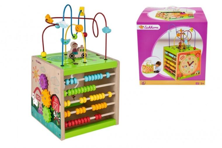 Kostka zawiera zegar, koła obrotowe, liczydło. Ćwiczy zdolności motoryczne dziecka.