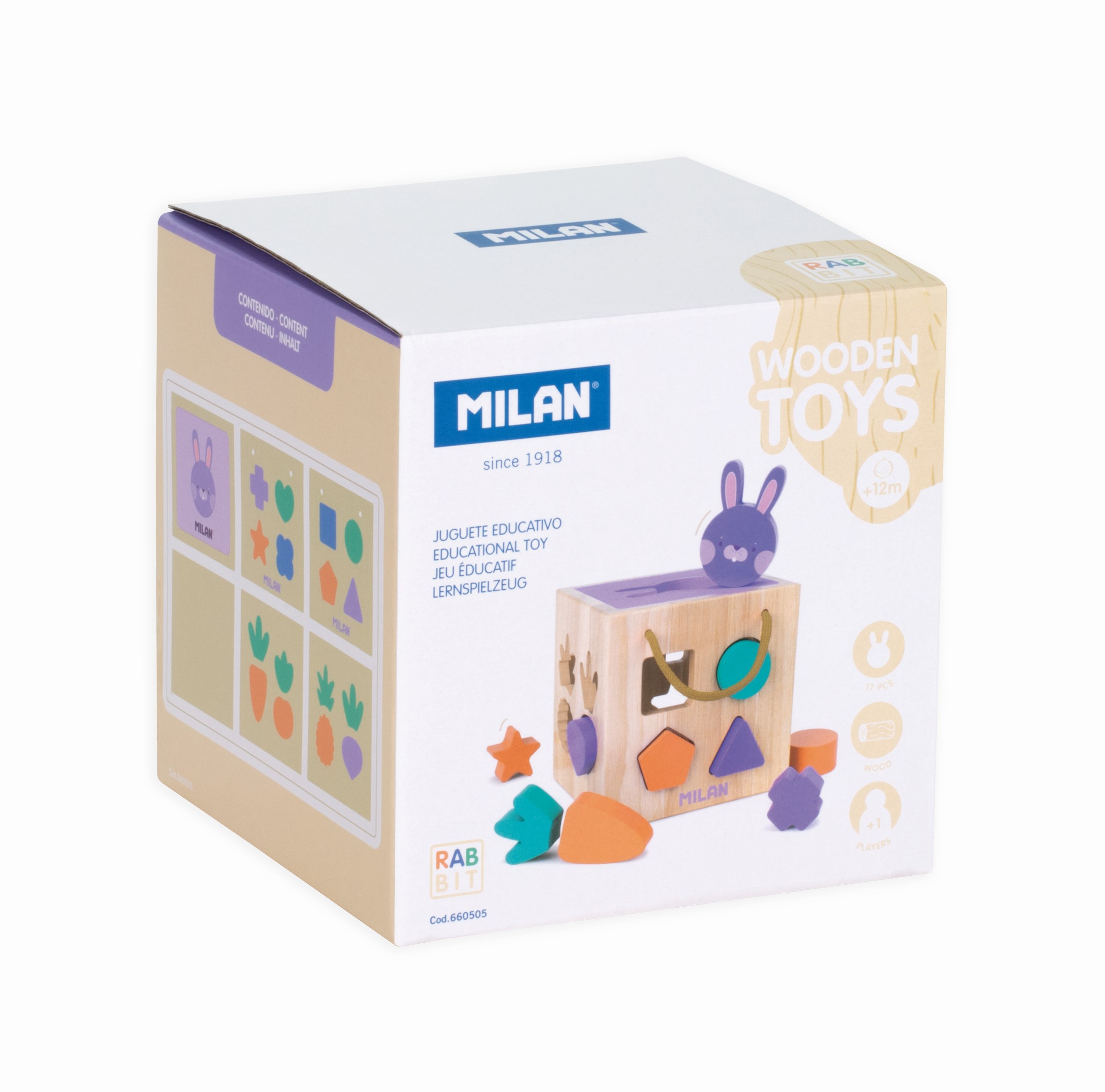 Opis produktuZasady bezpieczeństwaDrewniana zabawka edukacyjna "Królik" z 17 geometrycznymi, zaokrąglonymi elementami i kostką z dopasowanymi otworami oraz pokrywą do łatwego wyjmowania elementów. Zachęca do rozwoju umiejętności motorycznych, logiki i koordynacji wzrokowo-ruchowej. Zalecana od 12 miesiąca życia.