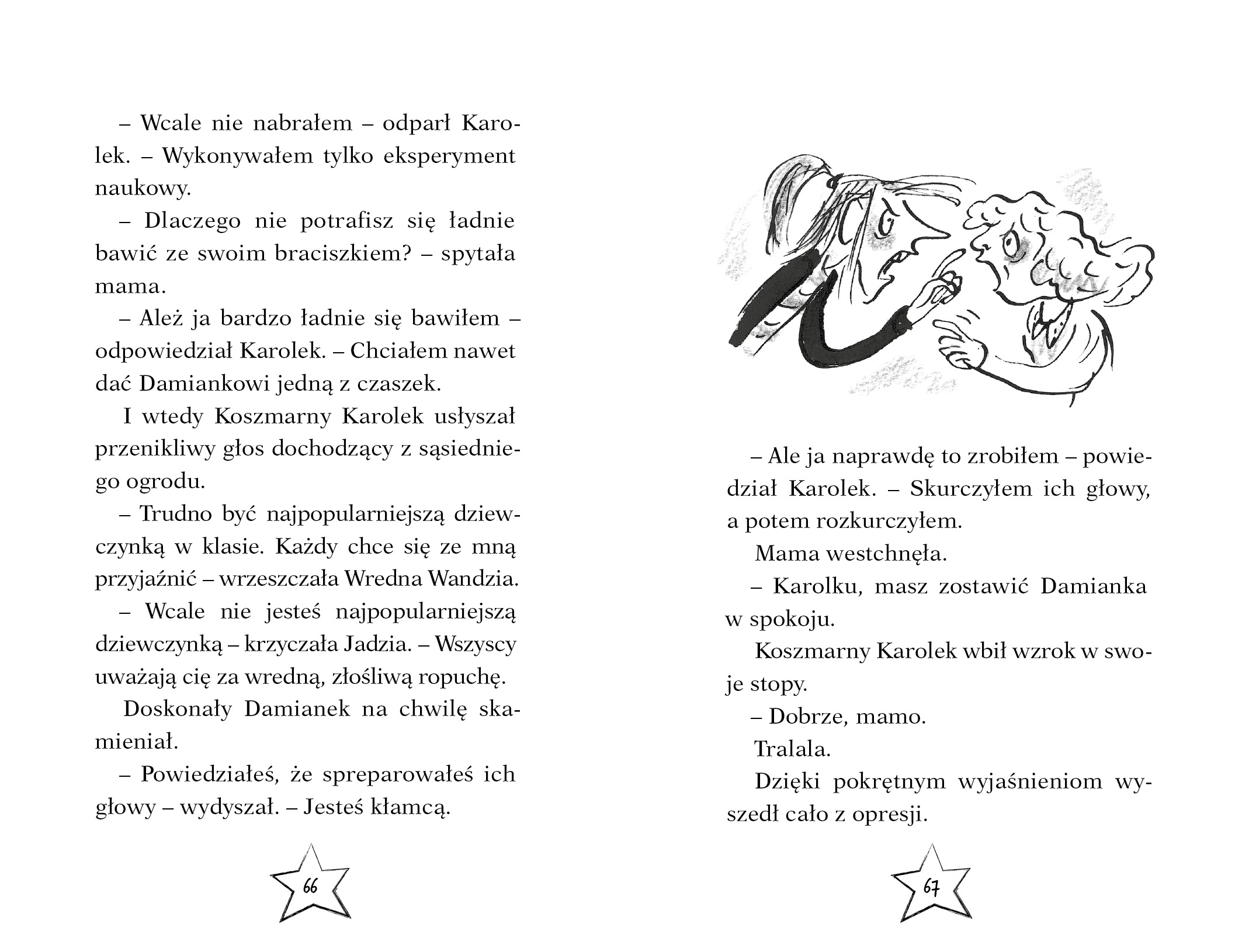 Nadszedł weekend, a to oznacza straszne obowiązki domowe. Czy moi niesprawiedliwi rodzice nie widzą, że ja tu tracę miesiące, lata, całe swoje życie na te niewolnicze czynności!? Ale już mam genialny pomysł, jak uwolnić się od tego cotygodniowego cierpienia! Kolekcja arcydożartych żartów i niecnych podstępów, które każde dziecko chciałoby zrobić, ale wystarczy, jak o nich poczyta lub ich posłucha. Najbardziej koszmarny bohater literatury dziecięcej powraca! Seria o Koszmarnym Karolku bawi od prawie 30 lat, a jego postać i arcydożarte żarty są wciąż aktualne dla kolejnego pokolenia czytelników. Szalony humor, niegrzeczny bohater, krótkie, łatwe w lekturze opowiadania to jest to, co dzieci (i dorośli też) lubią najbardziej. x