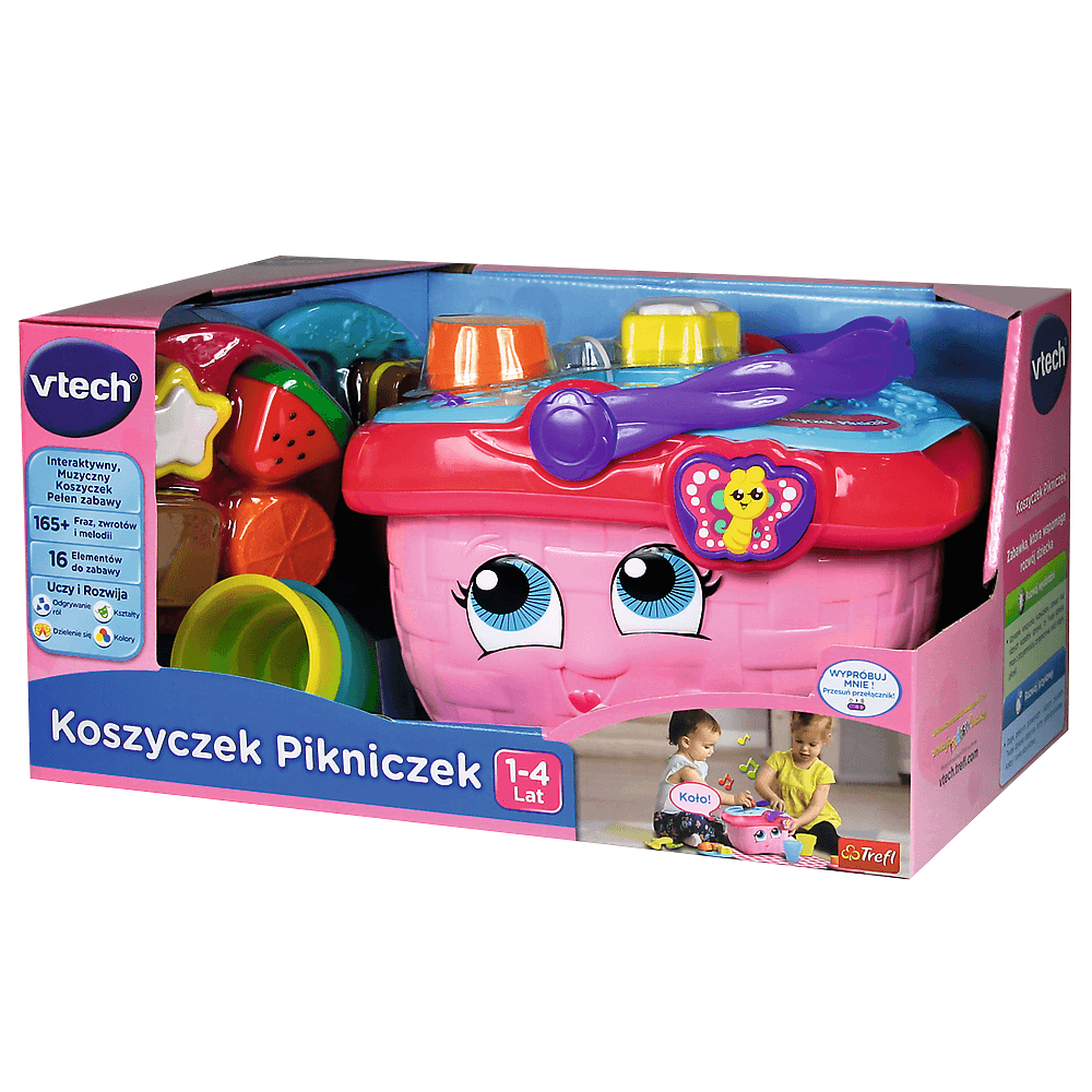 Bogaty w akcesoria, będzie wspaniałym urozmaiceniem zabawy. W zestawie: koszyczek, obrus, talerzyki, widelce, kubki. kształty: pomarańcze, kanapki, kawałki arbuza, ciastka. Posiada 3 warianty zabawy. Uczy kolorów, kształtów, zwrotów grzecznościowych, nazw jedzenia oraz umiejętności dzielenia się Ruchoma pokrywka posiada 4 otwory o różnych kształtach, dzięki czemu uczy dopasowywania kształtów Na piknik naszła mnie chęć, spakuj mój koszyk i do drogi szykuj się! x
