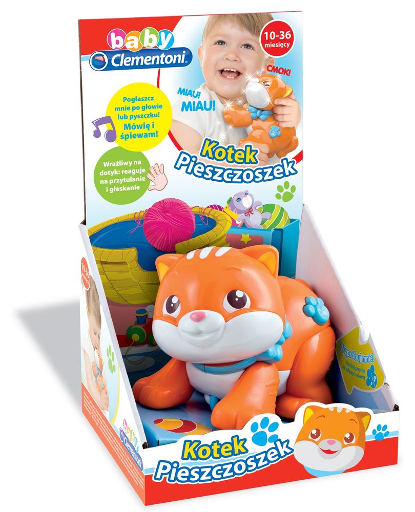 Po pogłaskaniu po pyszczku i po głowie mówi i śpiewa dzięki dwóm klawiszom czułym na dotyk. Rozwija percepcję wzrokową i słuchową. Stymuluje rozwój uczuciowy dzięki zabawnym piosenkom i rymowankom. Głowa obraca się mechanicznie. Kotek porusza się na trzech kołach umieszczonych w podstawie, po wprawieniu ich w ruch, mówi i śpiewa.
