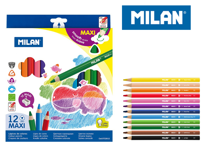 Kredki ołówkowe MAXI trójkątne z miękkim,Kredki sześciokątne, ołów o średnicy 5,8 mm. W zestawie 12 kolorów + temperówka.