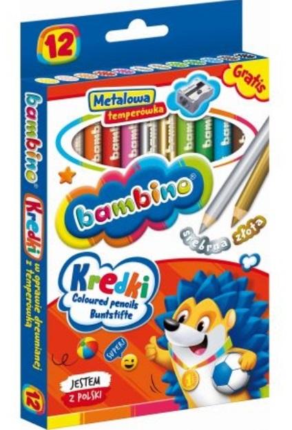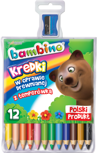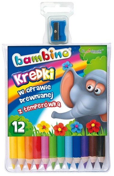 Wysokiej jakości kredki z glinki kaolinowej w drewnianej oprawie. Charakteryzują się wyjątkowo intensywnymi i nasyconymi kolorami. Doskonale kryją, idealnie nadają się do rysowania, wypełniania dużych powierzchni i wykonywania miękkich przejść pomiędzy kolorami. Kredki są grube, odpowiednio wyważone, przez co idealnie dopasowują się do małej dłoni dziecka. Produkowane są w Polsce, w zgodności z dyrektywą Parlamentu Europejskiego i Rady w sprawie bezpieczeństwa zabawek oraz rozporządzeniem Ministerstwa Gospodarki w sprawie zasadniczych wymagań dla zabawek, co gwarantuje bezpieczeństwo kredek Bambino. Licencja - BAMBINO Ilość kolorów - 12 Ilość sztuk w opakowaniu - 12 Cechy szczególne - Kredki o przekroju 7 mm, z temperówką w zestawie.