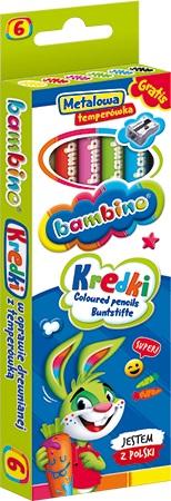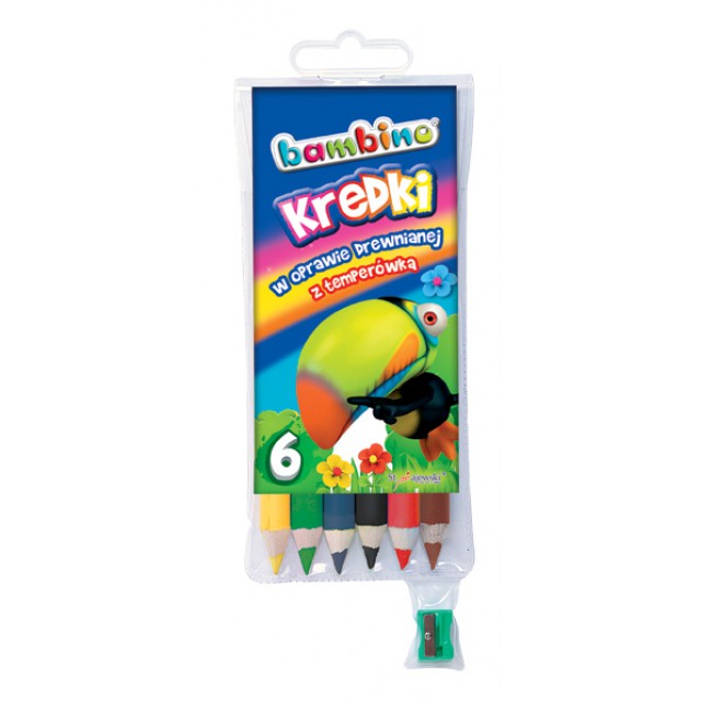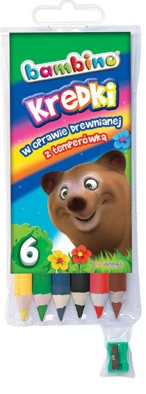 Wysokiej jakości kredki z glinki kaolinowej w drewnianej oprawie. Charakteryzują się wyjątkowo intensywnymi i nasyconymi kolorami. Doskonale kryją, idealnie nadają się do rysowania, wypełniania dużych powierzchni i wykonywania miękkich przejść pomiędzy kolorami. Kredki są grube, odpowiednio wyważone, przez co idealnie dopasowują się do małej dłoni dziecka. Produkowane są w Polsce, w zgodności z dyrektywą Parlamentu Europejskiego i Rady w sprawie bezpieczeństwa zabawek oraz rozporządzeniem Ministerstwa Gospodarki w sprawie zasadniczych wymagań dla zabawek, co gwarantuje bezpieczeństwo kredek Bambino. Licencja - BAMBINO Ilość kolorów - 6 Ilość sztuk w opakowaniu - 6 Cechy szczególne - Kredki o przekroju 7 mm, z temperówką w zestawie.