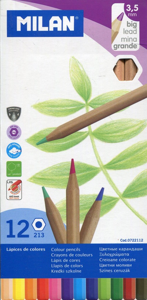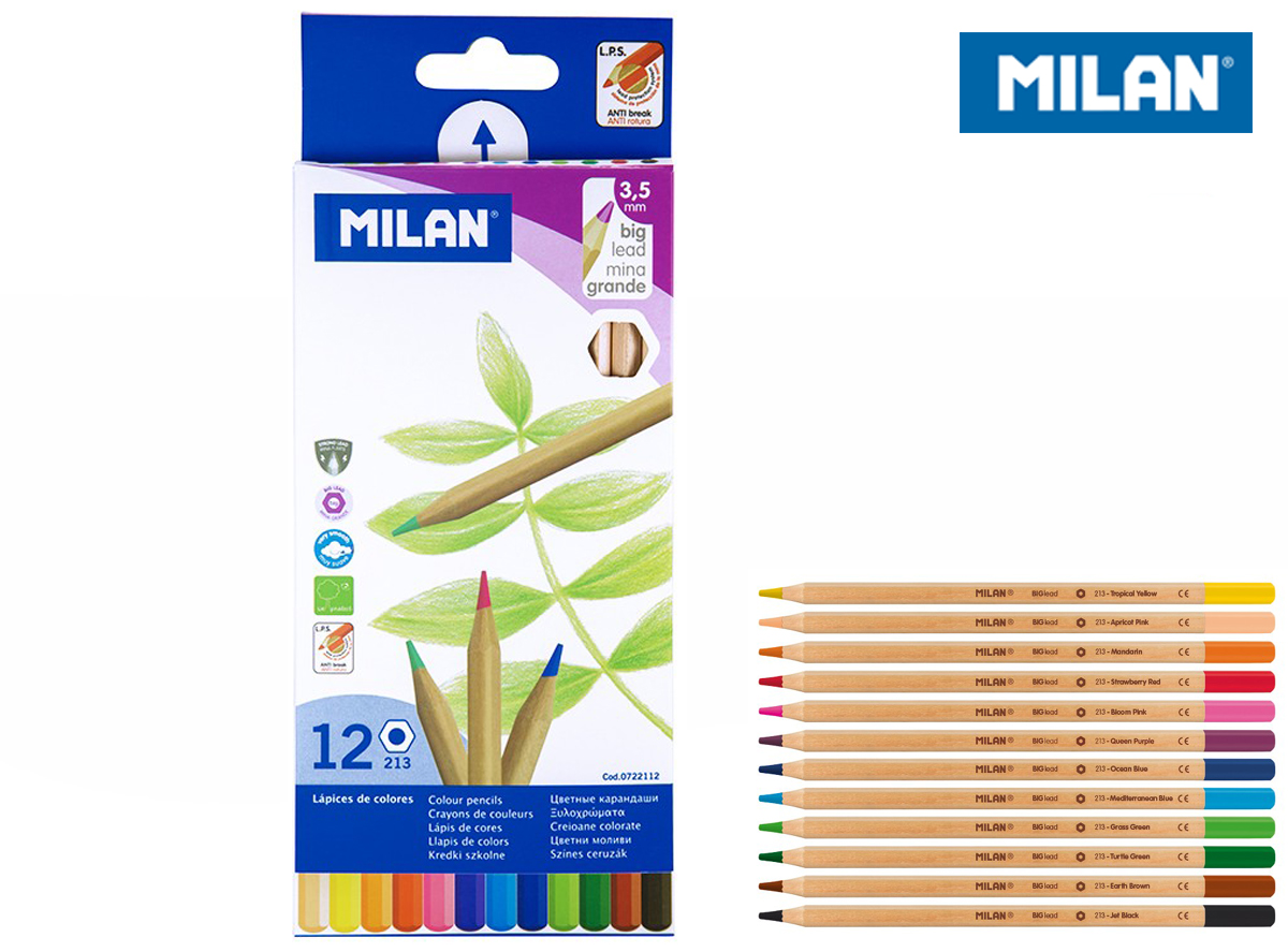 Kredki sześciokątne. Ołów o średnicy 3,3 mm, miękki. System ochrony rysika LPS zwiększający odporność na złamanie. Wysokiej jakości pigmenty w żywych, intensywnych kolorach, odporne na działanie światła. Kreska wykonana kredką MILAN jest miękka, jednolita o wyraźnym odcieniu. Nie tworzy rowków ani nie niszczy papieru.
