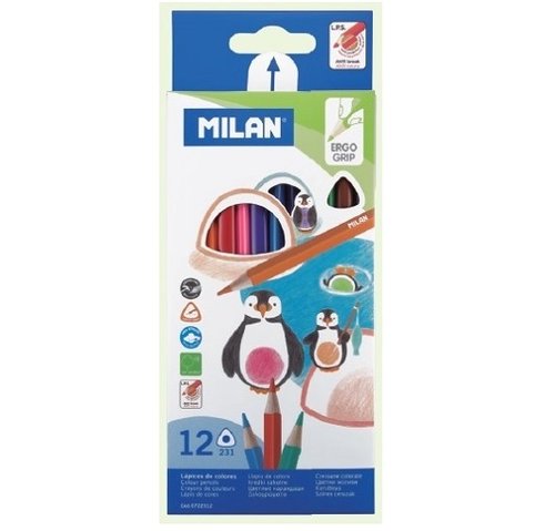 Kredki ołówkowe trójkątne. System ochrony rysika LPS zwiększający odporność na złamanie.Wysokiej jakości pigmenty w żywych, intensywnych kolorach, odporne na działanie światła. Kreska wykonana kredką MILAN jest miękka, jednolita o wyraźnym odcieniu. Nie tworzy rowków ani nie niszczy papieru.