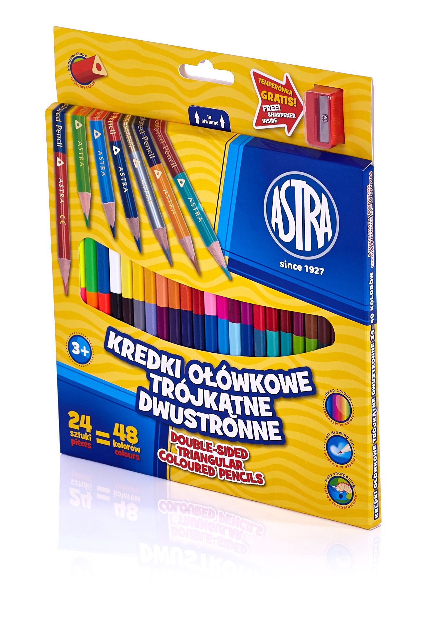 Kredki ołówkowe dwustronne ASTRA. Kredki posiadają trójkątny kształt. W pudełku znajdują się 24 dwustronne kredki co daje do dyspozycji 48 kolorów. Intensywne kolory. Wysokiej jakości drewno ułatwia wygodne temperowanie kredek.