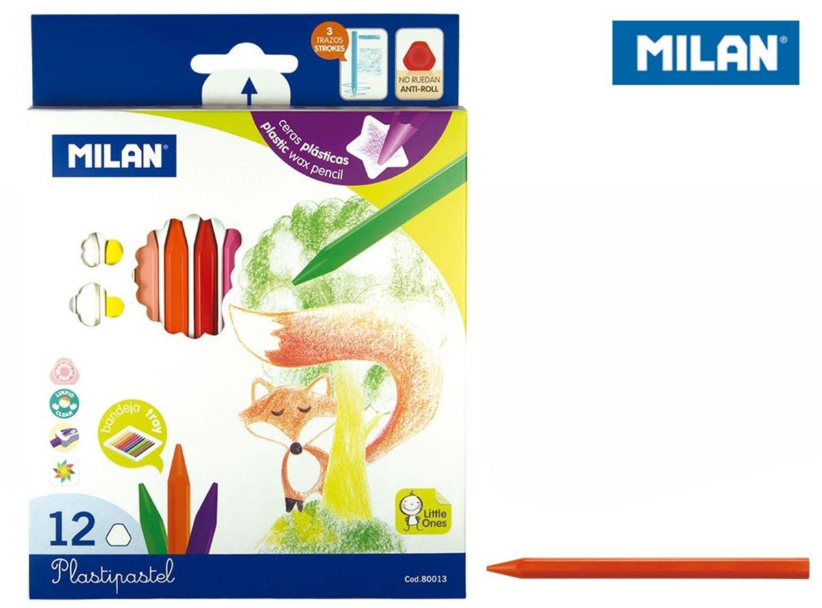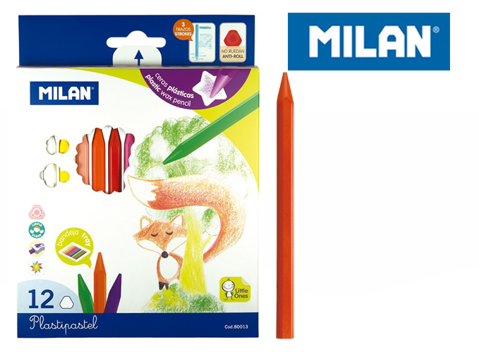 Kredki woskowe PLASTIPASTEL to mieszanka wosku, pigmentu i tworzywa termoplastycznego. Wytrzymała i miękka. Ergonomiczny, trójkątny kształt dostosowuje się idealnie do ręki dziecka i pomaga w wykonywaniu rysunków. Można nią rysować zarówno cienkie, jak i grube linie oraz zamalowywać większe przestrzenie całą powierzchnią kredki. Kredka jest bezwonna i nie brudzi rąk dzięki specjalnej konsystencji. Można ją zatemperować za pomocą każdej temperówki. Wymiary: długość 12 cm, średnica 7 mm. Kredki MILAN są zgodne z europejskimi i amerykańskimi normami bezpieczeństwa. Nie zawierają ftalanów, metali ciężkich i innych substancji toksycznych. Są bezpieczne dla dzieci.