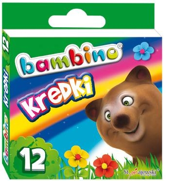 Wysokiej jakości kredki, które towarzyszą dzieciom od pokoleń. Wyróżniają je wyjątkowo intensywne i nasycone kolory oraz doskonale krycie powierzchni. Idealnie nadają się do rysowania, wypełniania dużych płaszczyzn i wykonywania miękkich przejść pomiędzy kolorami. Kredki Bambino wykonane są z glinki kaolinowej, co nieporównywalnie podnosi ich walory użytkowe względem kredek świecowych, woskowych czy ołówkowych. Każda kredka posiada papierową ochronną owijkę z własną grafiką (na każdej kredce inne zwierzątko). Kredki Bambino są bezpieczne dla dzieci, ich produkcja odbywa się w Polsce, w zgodności z dyrektywą Parlamentu Europejskiego i Rady w sprawie bezpieczeństwa zabawek oraz rozporządzeniem Ministerstwa Gospodarki w sprawie zasadniczych wymagań dla zabawek. Licencja - BAMBINO Ilość kolorów - 12 Ilość sztuk w opakowaniu - 12 Cechy szczególne - Jedyna taka, oryginalna kredka BAMBINO.