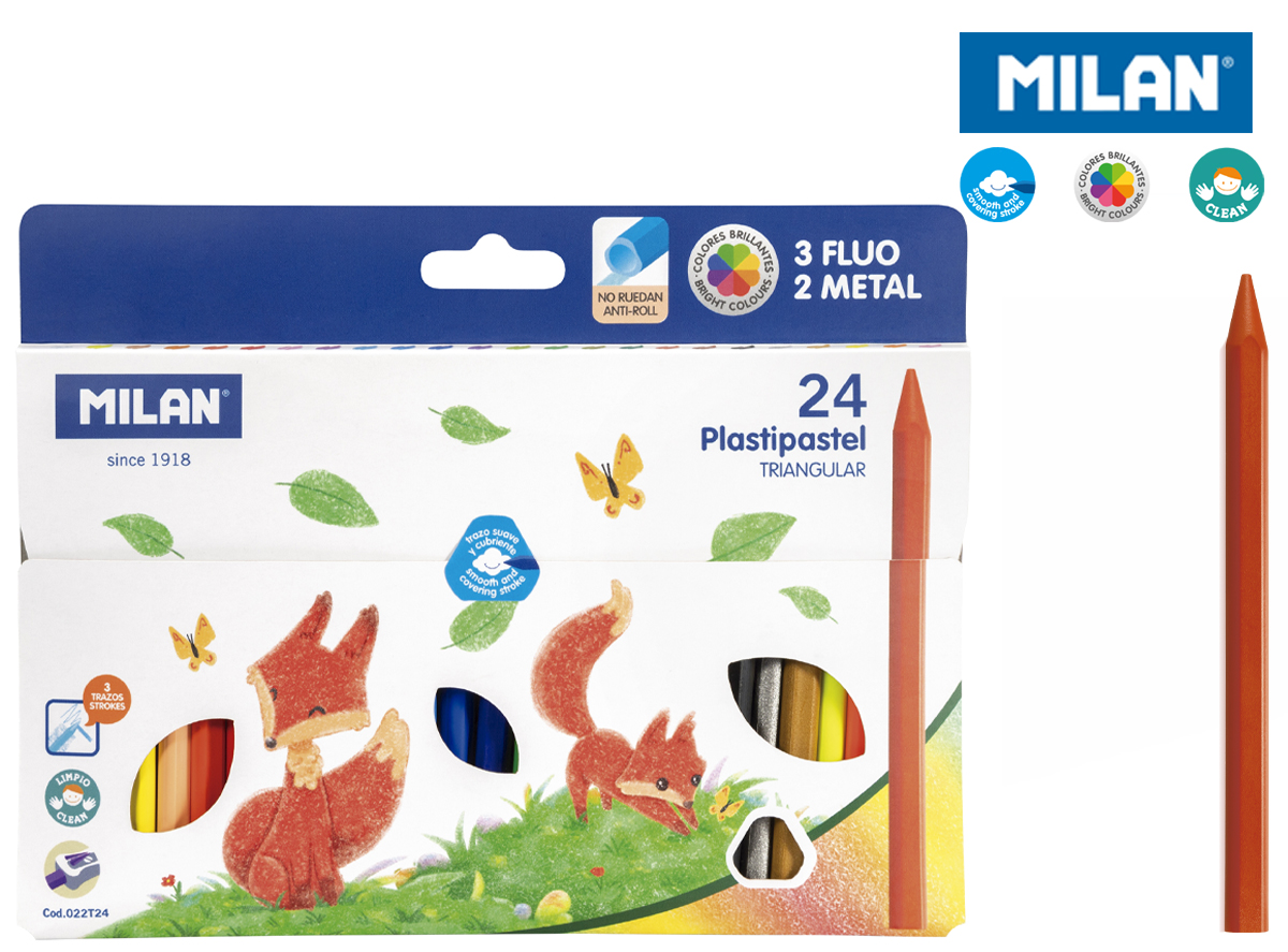 Kredki świecowe PLASTIPASTEL. 19 podstawowych kolorowów oraz 2 kredki metaliczne i 3 kredki fluo. Czyste i wytrzymałe, ich trójkątny kształt z zaokrąglonymi krawędziami sprawia, że idealnie pasują do rąk dzieci w wieku szkolnym i zapobiegają przesuwaniu się kredki po powierzchni roboczej. Nowa formuła: gładsza i bardziej kryjąca kreska. 3 różne pociągnięcia: cienkie kreski można narysować za pomocą końcówki kredki zaś grube kreski za pomocą tylnej części, a do zamalowywania dużych obszarów używamy całej ich długości. Kredka jest bezwonna i nie brudzi rąk ani tkanin. Można ją zatemperować za pomocą każdej temperówki. Miękka, umożliwia mieszanie kolorów. Kredki MILAN są zgodne z europejskimi i amerykańskimi normami bezpieczeństwa. Nie zawierają ftalanów, metali ciężkich i innych substancji toksycznych. Są bezpieczne dla dzieci. Rozmiar kredki: 12 x 0,8 cm. Rozmiar opakowania: 20 x 15,5 x 1 cm.