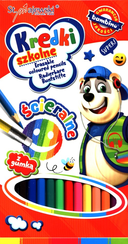 Opis produktuZasady bezpieczeństwaKredki szkolne ścieralne 12 kolorów + temperówka. Cechy produktu: