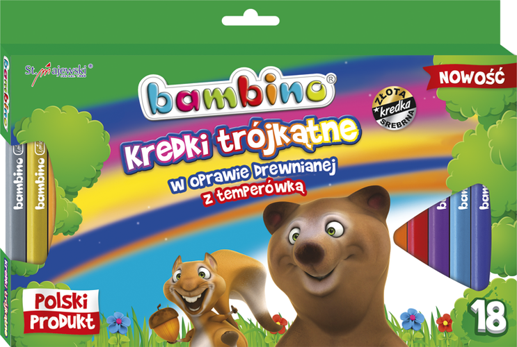 Opis produktuZasady bezpieczeństwaKredki trójkątne drewniane 18 kolorów + temperówka. Cechy produktu: