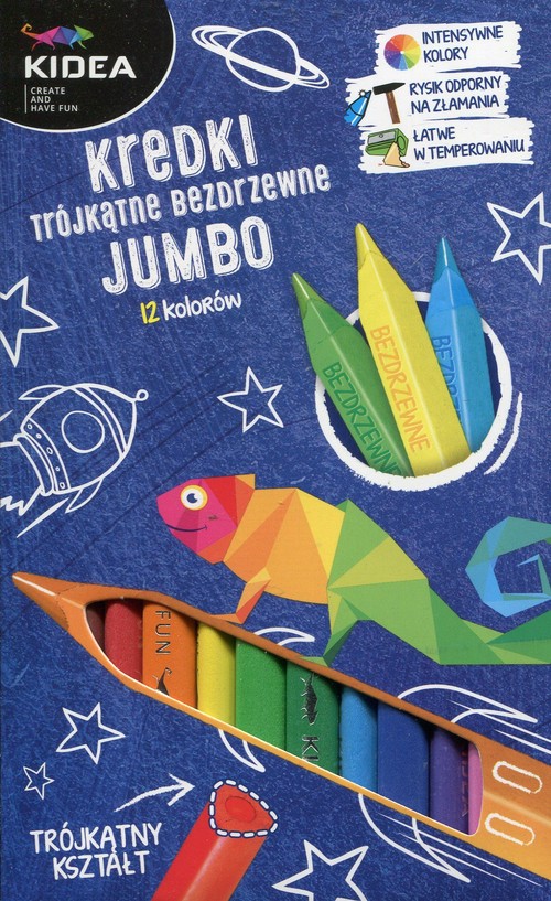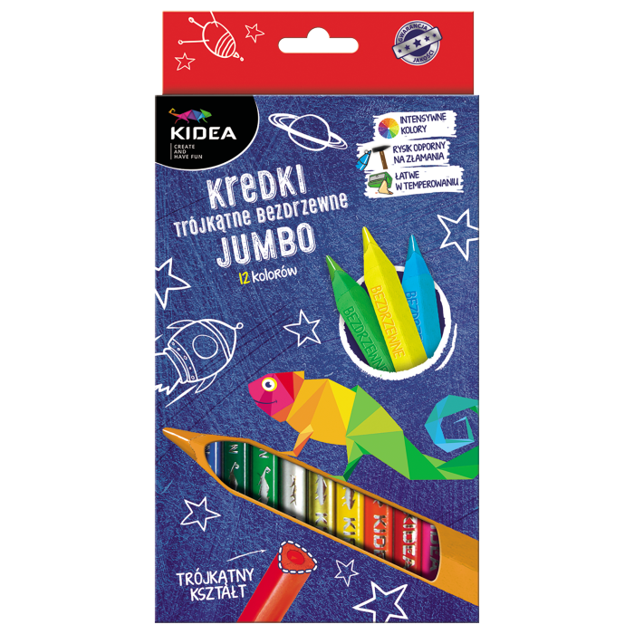 Kredki trójkątne bezdrzewne Jumbo 12 kolorów,intensywne kolory, trójkątny kształt, grube, łatwe w temperowaniu,