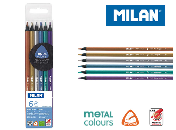 Kredki MILAN trójkątne z grafitem metalizowanym 6 kolorów.