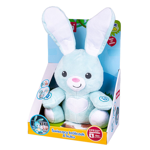 Śpioszek Króliczek A ku Ku to miękka, przyjemna w dotyku, interaktywna przytulanka. Mówi po polsku, ma świecący brzuszek i opadające uszka. Po wciśnięciu przycisku Króliczek bawi się w A ku ku, wypowiada frazy, śpiewa piosenki.