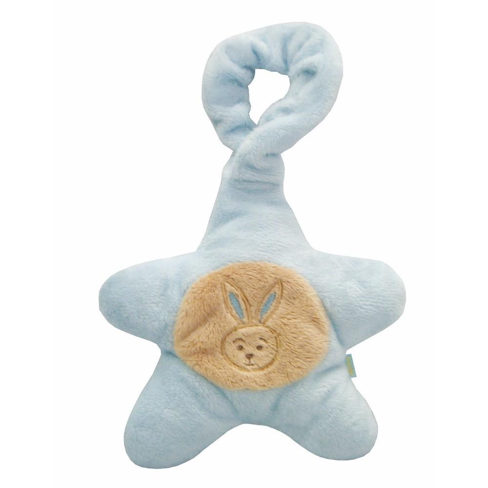 Grzechotka pluszowa gwiazdka Grzechotka wykonana z doskonałej jakości pluszu w kształcie gwiazdki z pluszową zawieszką. Całość w łagodnych, pastelowych kolorach z jasnobeżową wstawką i wyhaftowaną główką króliczka.