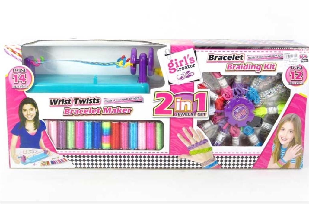 Duży zestaw do samodzielnego wykonywania bransoletek. Zawiera krosno, 12 kolorowych sznurków, 14 satynowych nitek i koraliki.