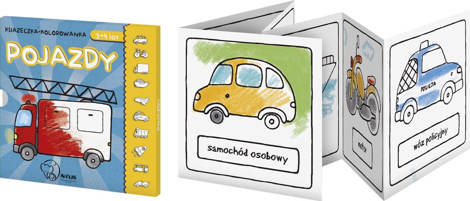 W tej niewielkiej książeczce czekają na Was samochody, samolot, statek i kilka innych pojazdów, które dzieci mogą samodzielnie pokolorować tak, jak podpowiada im wyobraźnia. Ilustracje są proste i przejrzyste, a do kolorowania możecie używać kredek, flamastrów i farb. Niewielkie rozmiary sprawią, że książeczka zmieści się w torbie każdej mamy, dzięki czemu możecie ją wszędzie ze sobą zabrać. świetnie sprawdzi się w przedszkolu, w poczekalni czy w podróży. Książeczka zapakowana jest w poręczne etui, które nie tylko ułatwia zachowanie porządku, ale przede wszystkim zapewnia bezpieczne przechowywanie pokolorowanych obrazków. Możecie wspólnie wybrać kilka z nich, wyciąć je, oprawić w ramki i powiesić na ścianie albo podarować. Kolorujcie i poznawajcie świat. x