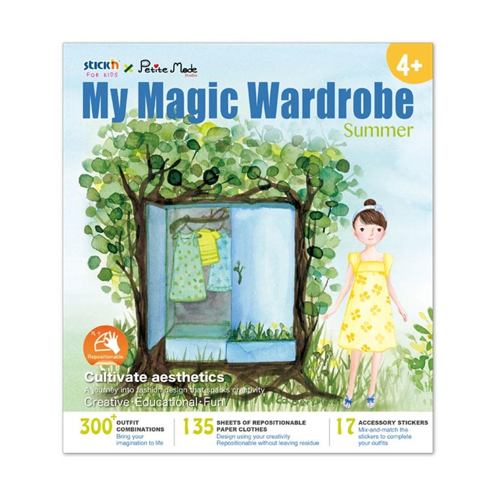 Papierowe stroje (10 rodzajów) można kolorować flamastrami lub kredkami. Wybrane elementy garderoby można dowolnie przyklejać na postacie uzupełniając ich kreacje gotowymi naklejkami (14 sztuk). Rozmiar zamkniętej książeczki: 21,5 x 4 cm. Po otwarciu: 64,4 x24 cm. Książeczka zapakowana w folię. 4 wersje zawierające ubiory na cztery pory roku. x