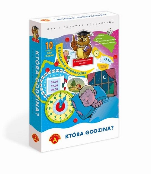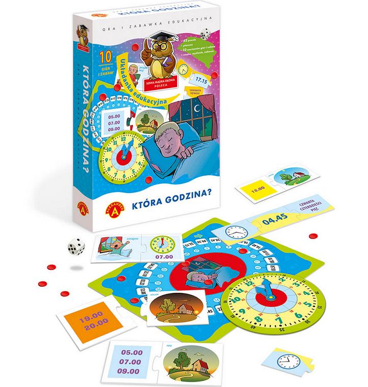"Która godzina?" - gry i zabawy, w których dzieci poznają zagadnienia związane z odmierzaniem czasu na tarczy zegarowej. W skład zabawki wchodzą trzy rodzaje puzzli: 1) przedstawiające związek godzin i codziennych czynności, 2) relacje godzin i pór dnia, 3) określenia czasu: na tarczy zegara, zapisie liczbowym i zapisie słownym. Plansza i tarcze zegarowe to rekwizyty emocjonującej gry, w której gracze muszą jak najszybciej przedstawić poprawny układ wskazówek na zegarze w odniesieniu do zapisu liczbowego godziny. Gry i zabawy są treningiem myślenia, koncentracji i pamięci. Zawartość pudełka: 42 puzzle, plansza, pionek, kostka, 3 tarcze zegara, 40 żetonów, instrukcja.