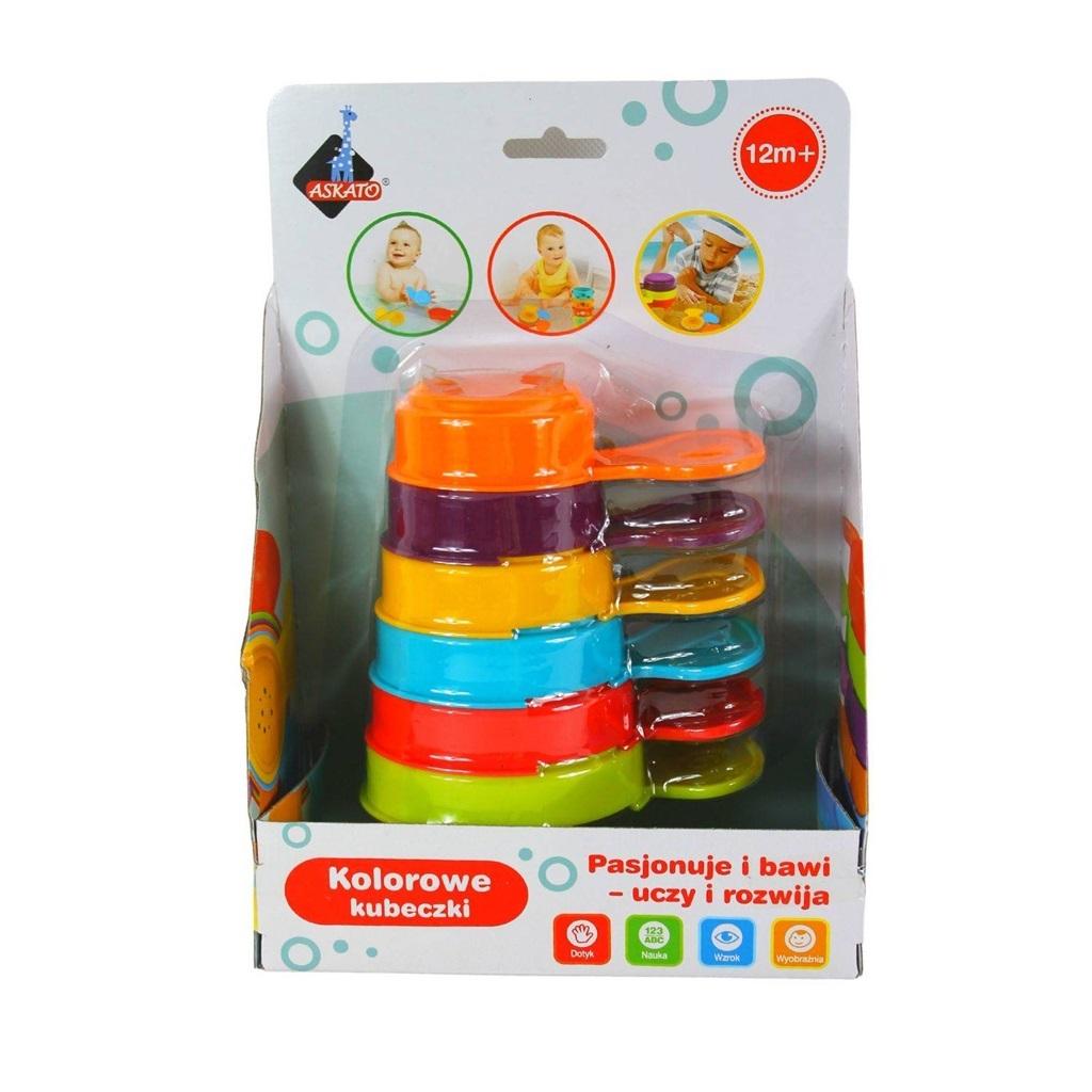 Kubeczki można włożyć jedno w drugie, lub zbudować wieże- co rozwija u maluchów sprawność manualną i koordynację ruchową.