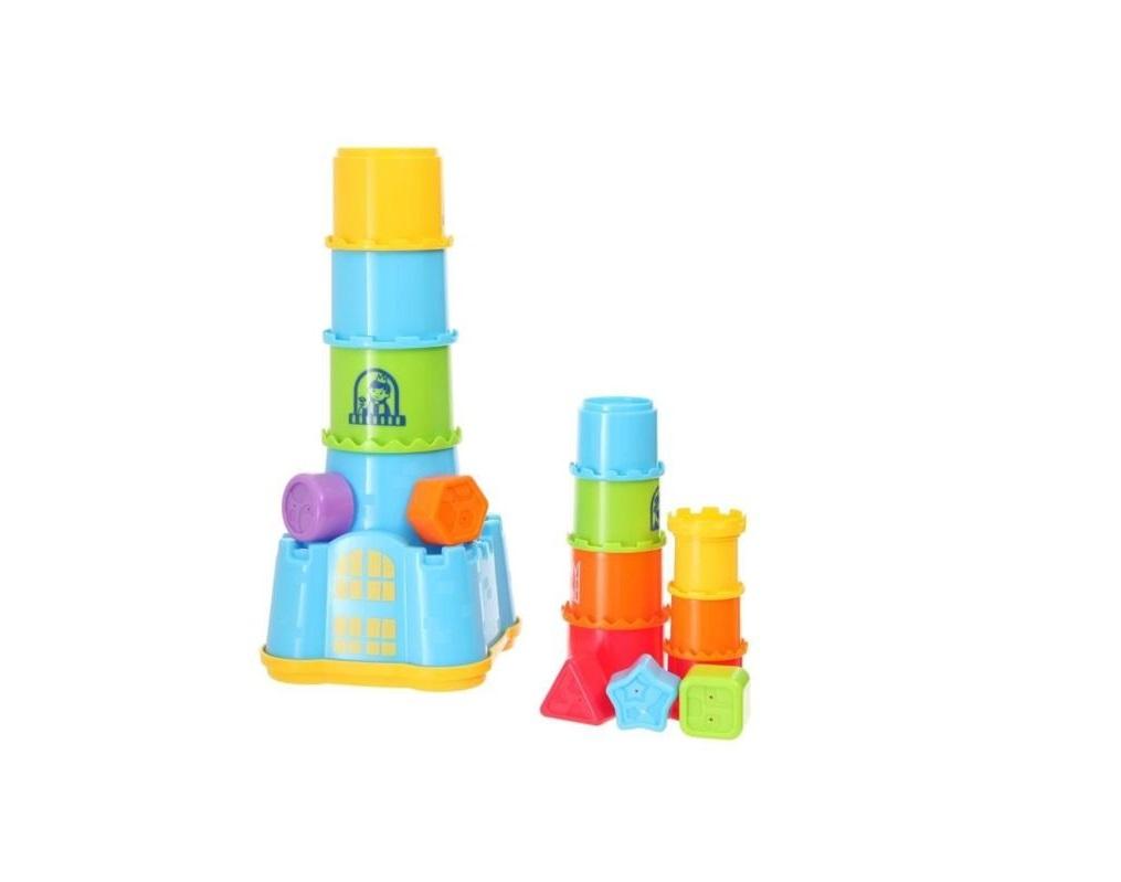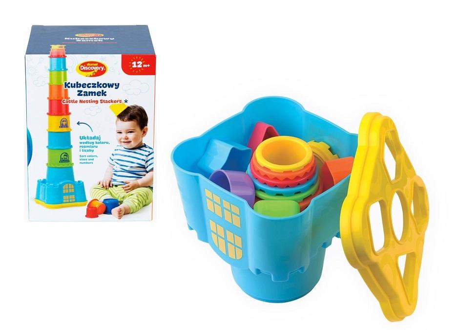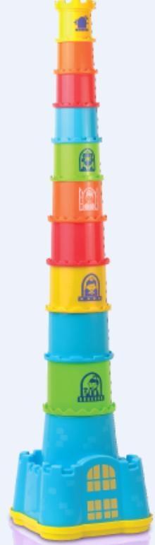 Dziecko ma do dyspozycji 11 elementów o różnej wielkości i kolorach, każdy oznaczony cyferką. Maluch może ułożyć z kubeczków wieżę, której wysokość to, aż 73 cm! Dzięki temu, że kubeczki są ponumerowane dziecko układa je po kolei i uczy się liczyć. Dodatkowo podstawa wieży ma kształt zamku, który może służyć jako pojemnik do przechowywania klocków. Nakładka na zamek ma otwory o różnych kształtach, dzięki czemu maluch może dopasowywać klocki kształtem. Kubeczki mogą służyć również jako zabawka.
