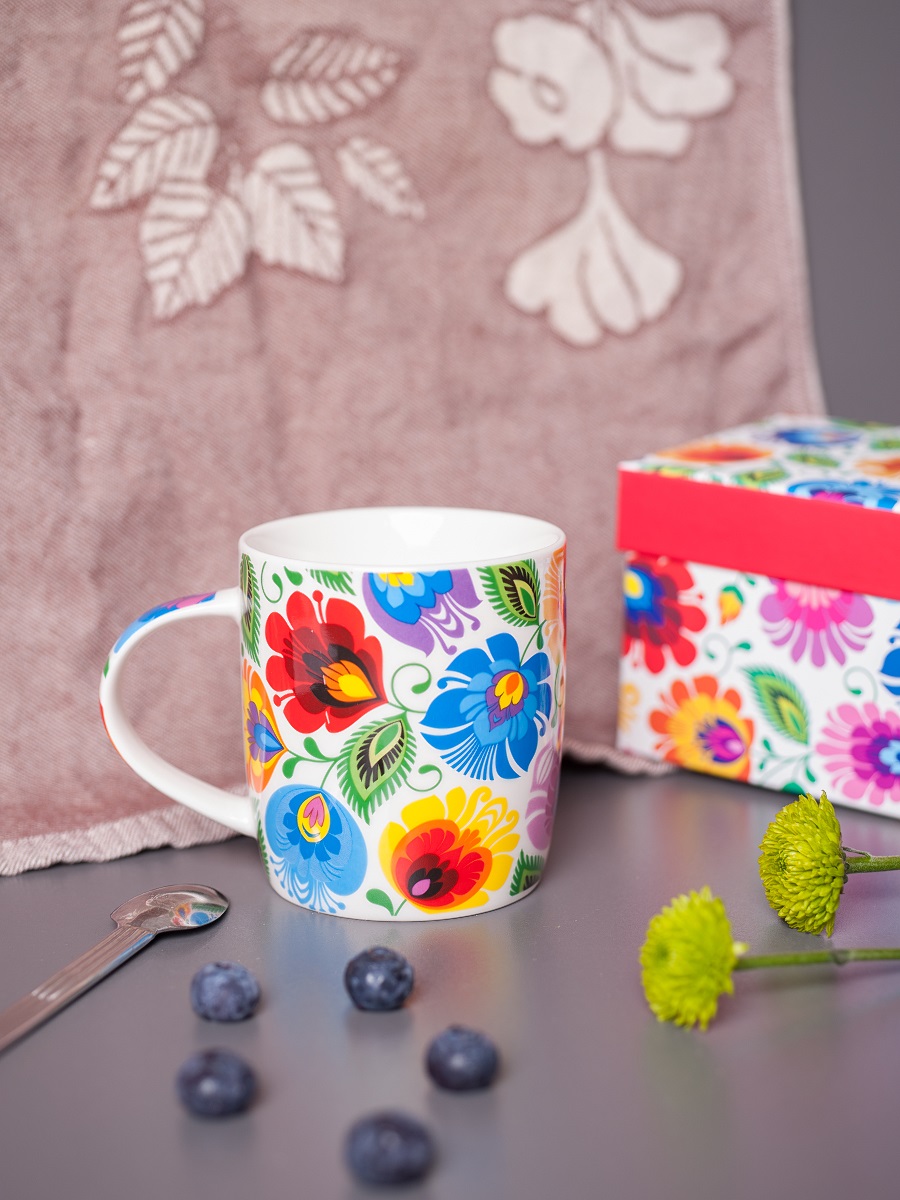 - doskonały prezent z Polski - łowicka wycinanka była inspiracją dla wzoru - podstawowymi elementami wycinanek łowickich są koguty, pawie oraz wielobarwne kwiaty - wzór ludowy znajduje się na całej powierzchni kubka oraz uchu - ozdobne pudełko w zestawie gotowy prezent! - wykonany z lekkiej porcelany - można myć w zmywarce x