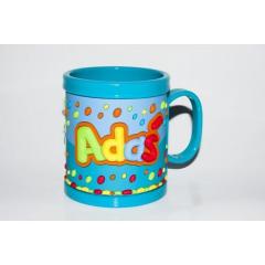 Plastikowy kubek imienny dla dziecka, na zewnątrz pokryty antypoślizgową gumą. Posiada wygodny duży uchwyt do trzymania. Idealny do domu, przedszkola lub na wyjazdy.