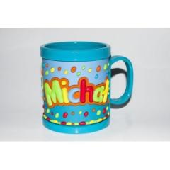 Plastikowy kubek imienny dla dziecka, na zewnątrz pokryty antypoślizgową gumą. Posiada wygodny duży uchwyt do trzymania.