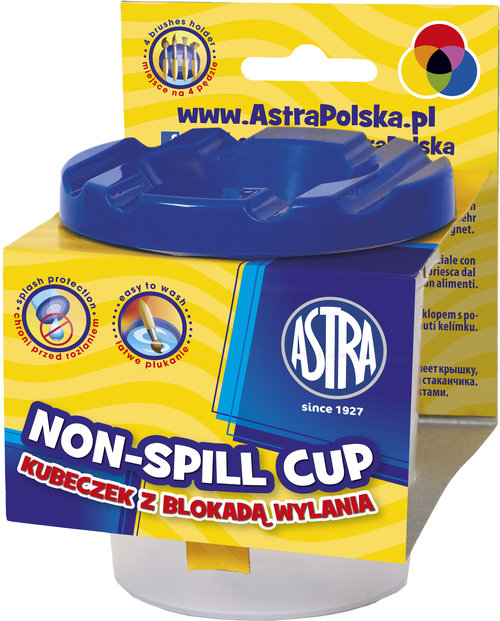 Kubeczek z blokadą wylania ASTRA zabezpiecza miejsce prac plastycznych. Blokada hamuje płyn przed wydostaniem się z pojemnika w przypadku jego niekontrolowanego przechylenia lub przewrócenia. Pojemność - 150 ml.