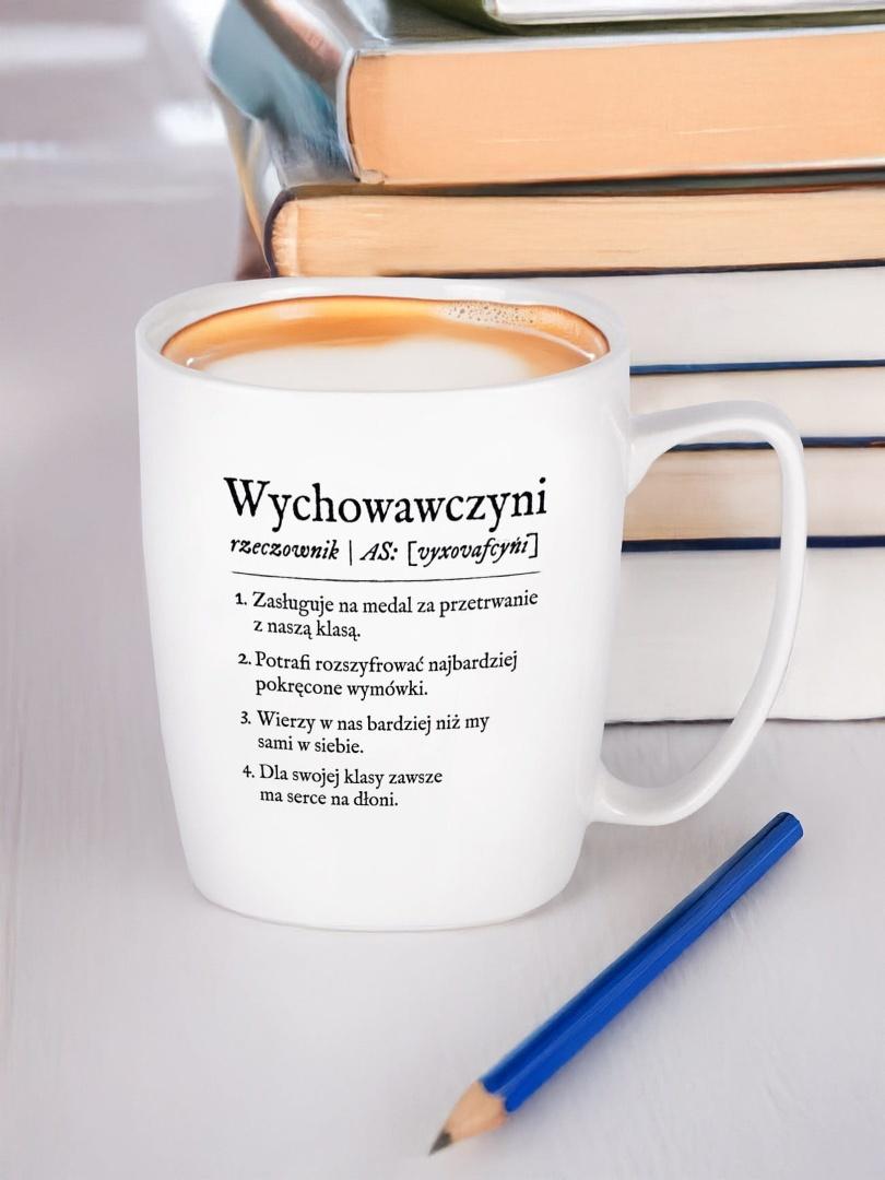 Zna klasę jak własną kieszeń, ogarnia plan lekcji, sprawy wychowawcze i jeszcze pamięta o urodzinach uczniów. Kubek WYCHOWAWCZYNI z definicją to drobny ukłon w stronę tych nauczycielek, które są trochę mentorkami, trochę terapeutkami, a często cichymi bohaterkami dnia codziennego. Prosty, klasyczny, codziennie potrzebny tak, jak dobra wychowawczyni.