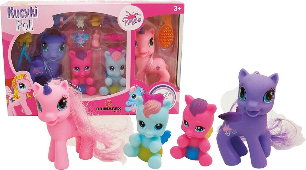 Zawiera 13 elementów: 4 kucyki, butelka, szczotka, spinki, akcesoria