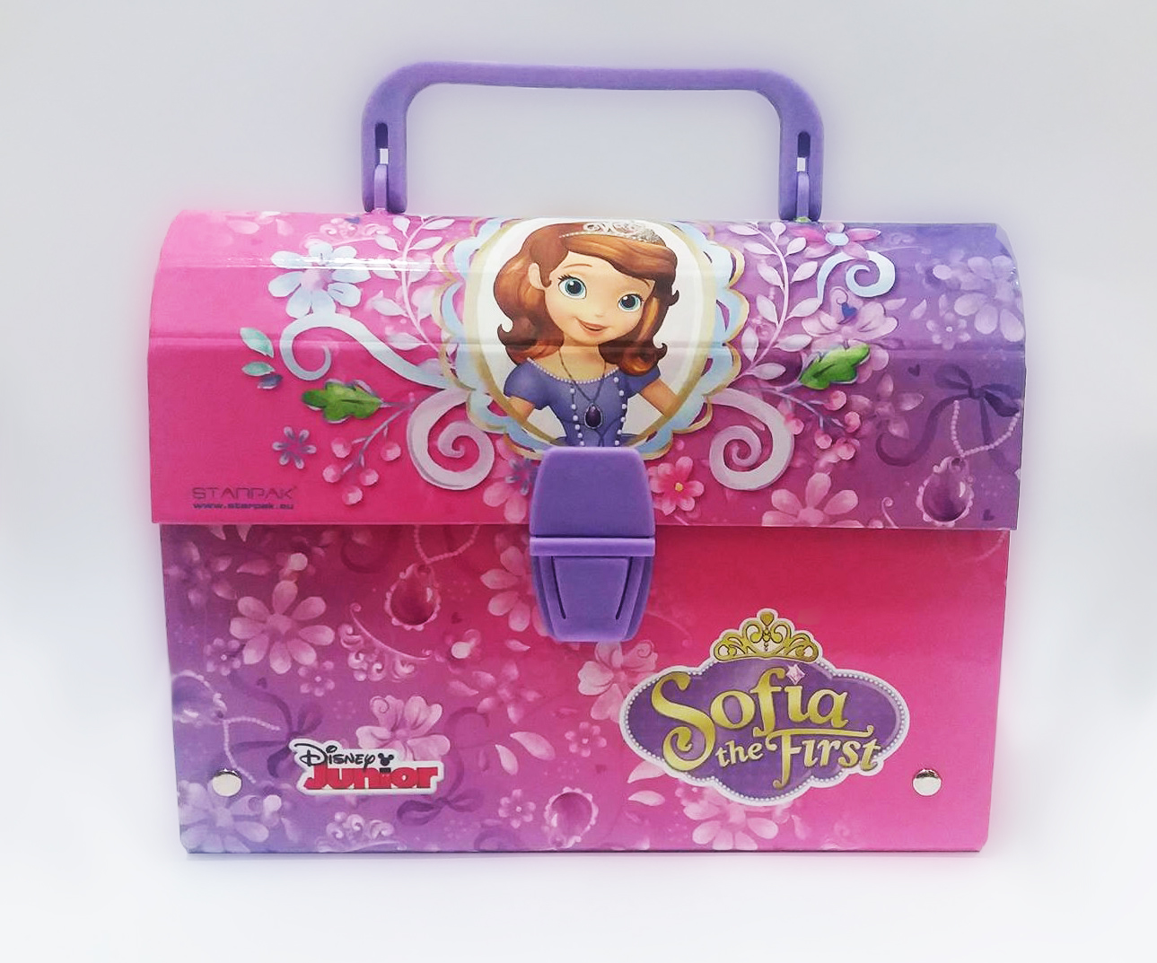 Kuferek z grubego, lakierowanego kartonu, zamykany na metalowe zatrzaski, wyposażony w solidną rączkę, wzmocniony metalowymi nitami. Idealny na drugie śniadanie lub na zajęcia pozaszkolne.