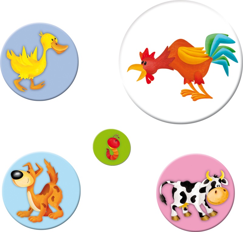 Proste zasady, komiczne sytuacje, wynikające z konieczności naśladowania zwierzęcych głosów, możliwość wspólnej zabawy maluchów z dorosłymi, to atuty tej gry. Potrzebne do niej będą: świetny refleks, spostrzegawczość i dobry głos. Daje to gwarancję zgromadzenia największej liczby żetonów z robaczkami - przysmakiem koguta..., który jest jokerem w tej grze.