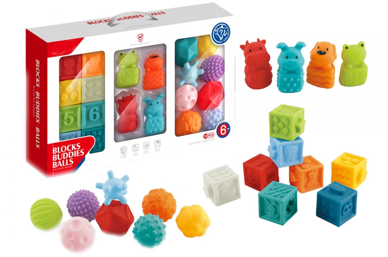 Zestaw 20 sensorycznych wytłaczanych miękkich kształtów: 8 kostek edukacyjnych wykonanych z nietoksycznej i bezpiecznej gumy. 4 klocki edukacyjne, 8 piłek sensorycznych.