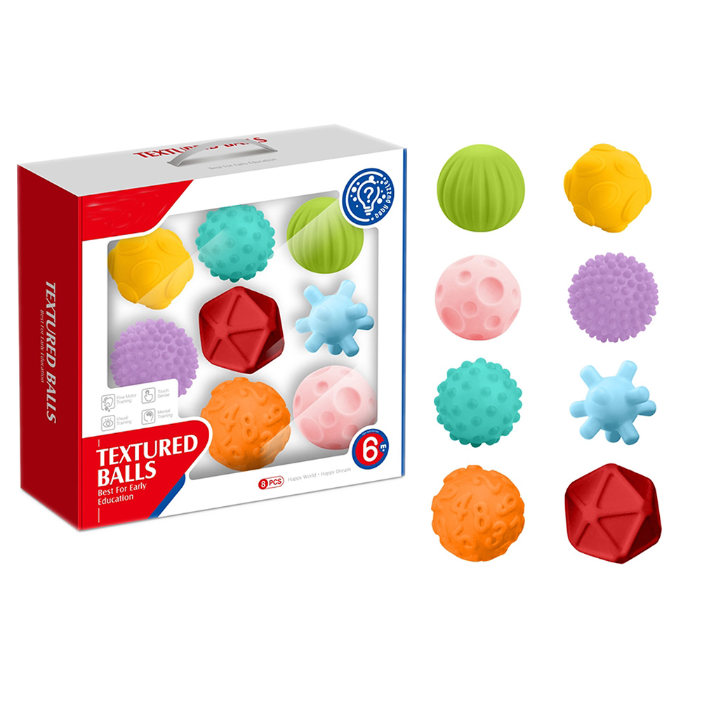 Opis produktuZasady bezpieczeństwaZestaw 8 elementów zabawek sensorycznych Idealna zabawka dla malucha, bowiem ma wpływ na integrację sensoryczną dziecka, rozwija zmysł dotyku, wzrok, koordynację oraz motorykę rączek i paluszków. Każda element ma inny kształt, fakturę i kolor. Wielkością idealnie pasuje do małych rączek. Jest z miękkiego tworzywa bezpiecznego dla dziecka. Doskonałe do rzucania, toczenia, ściskania, a nawet żucia. x