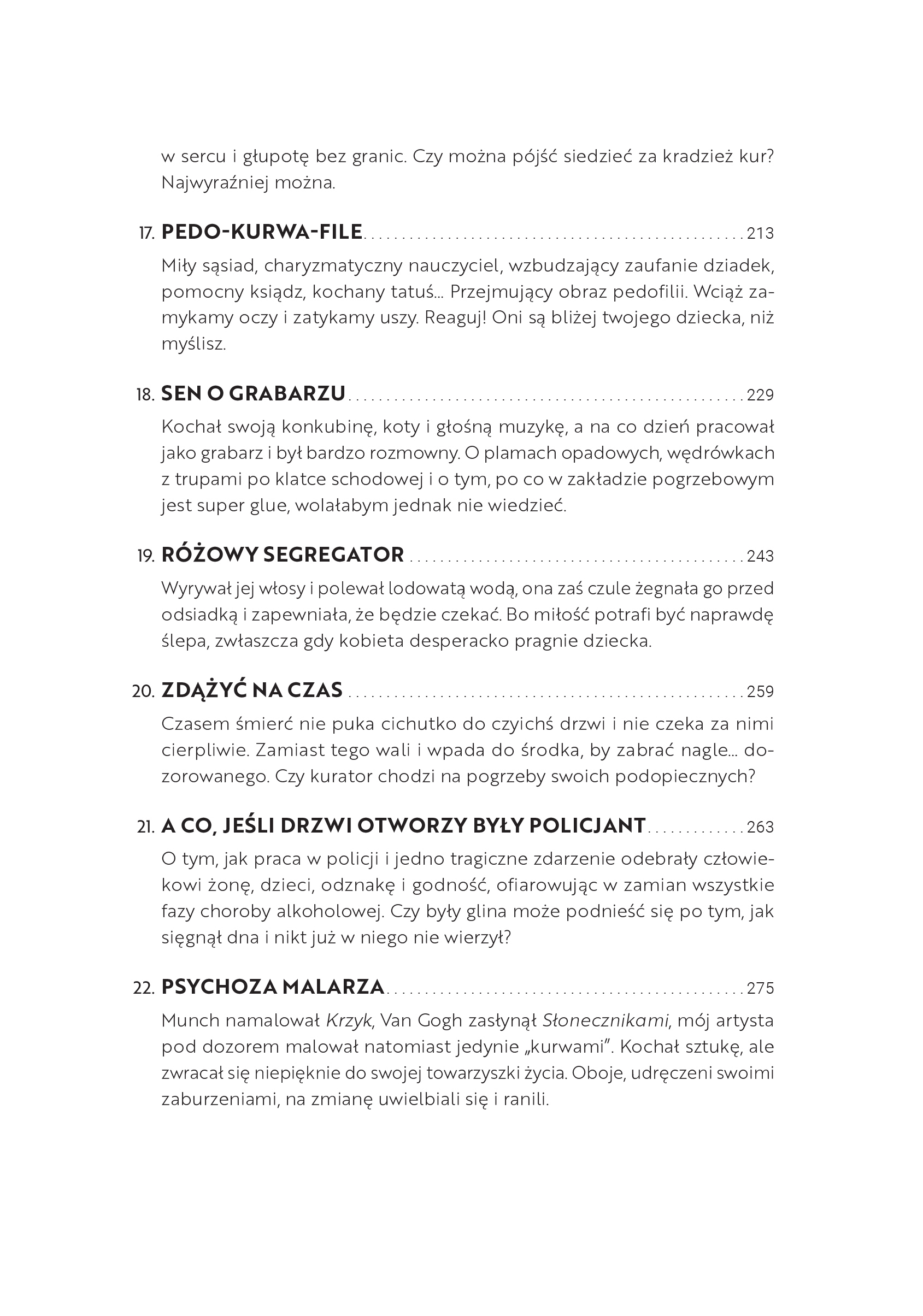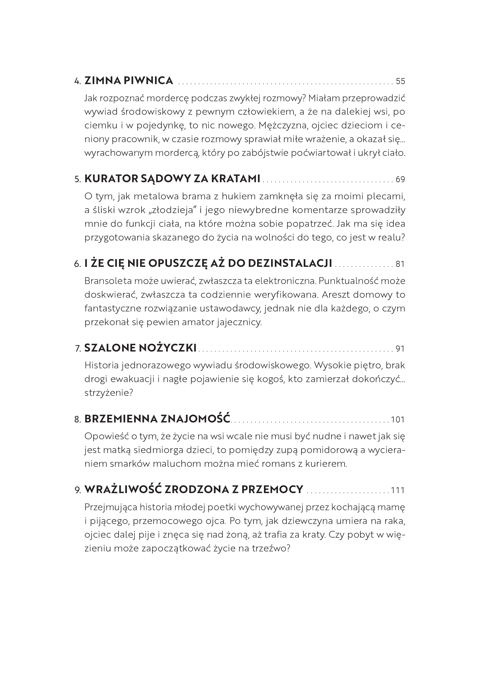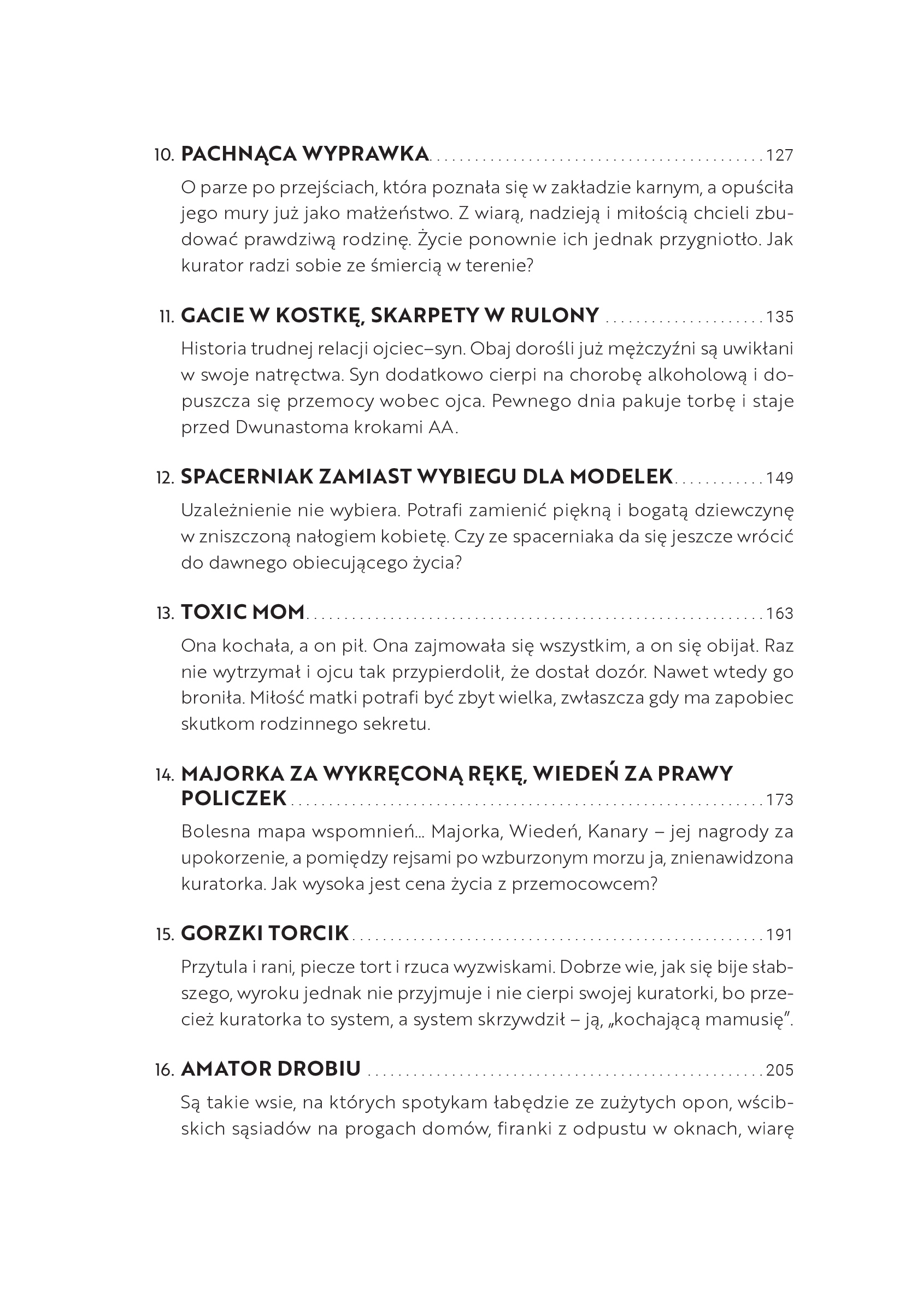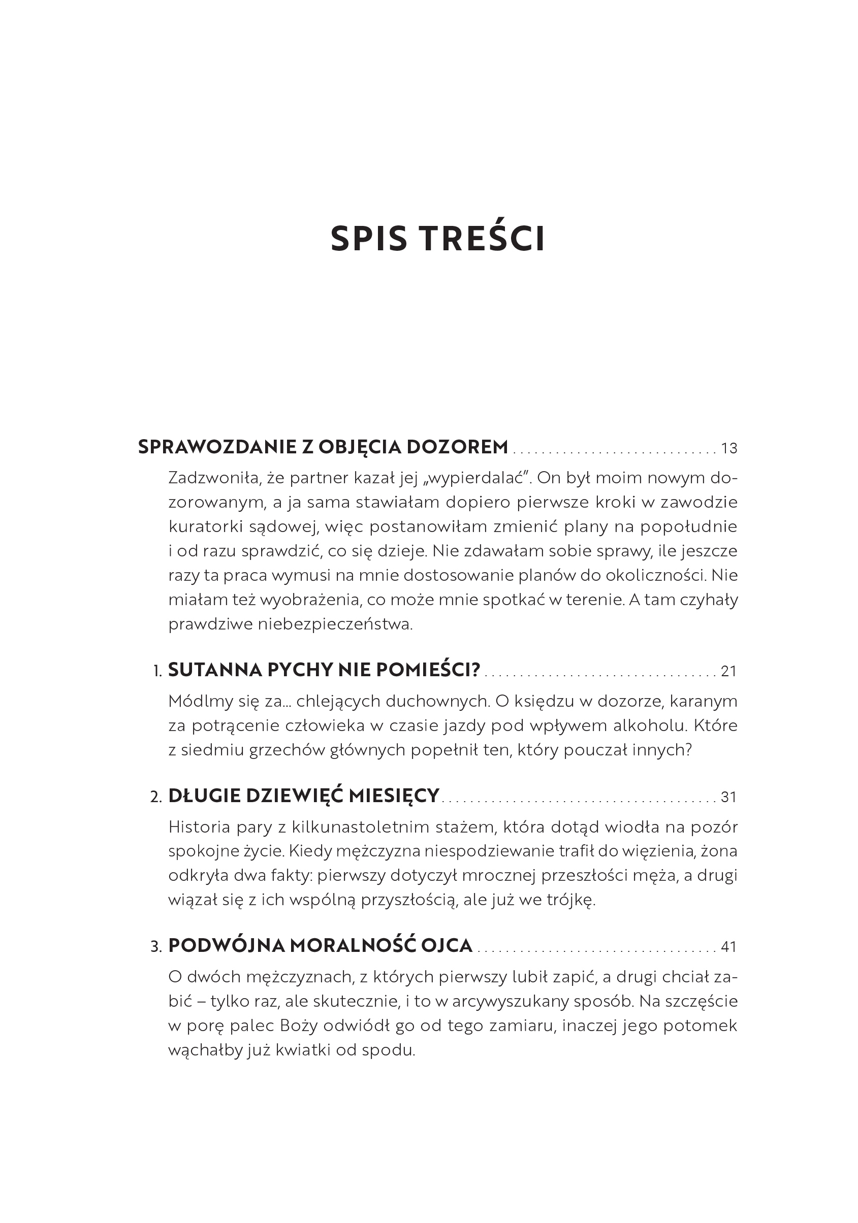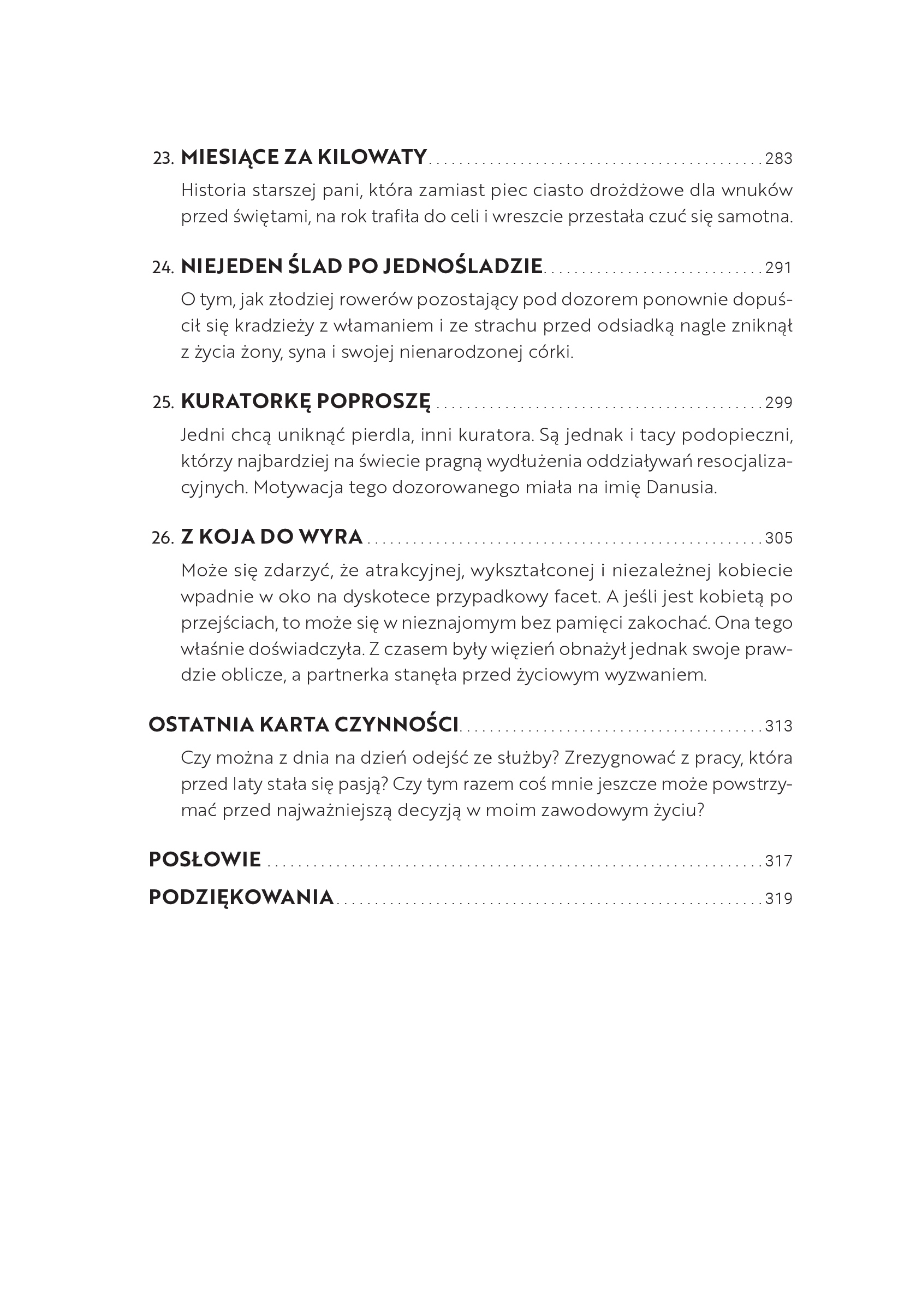 Lubimy myśleć, że takie historie dzieją się tylko w kryminałach, gdzieś daleko, na pewno nie u nas ani nie u sąsiada. Autorka – doświadczona kuratorka sądowa z pionu karnego – niszczy tę wygodną iluzję, zabierając czytelnika ze sobą „w teren”, by zrelacjonować najbardziej wstrząsające i poruszające historie ze swojej codziennej pracy. Para, która poznała się i pobrała w więzieniu, grabarz, cierpiący na schizofrenię malarz, który znęcał się nad partnerką, dziewczyna „z dobrego domu”, wzbudzający współczucie zabójca własnej żony… Wśród jej podopiecznych znajdują się osoby z różnych środowisk, a każda z nich skrywa własne bolesne tajemnice. Teraz i ty możesz odkryć je razem z nią.