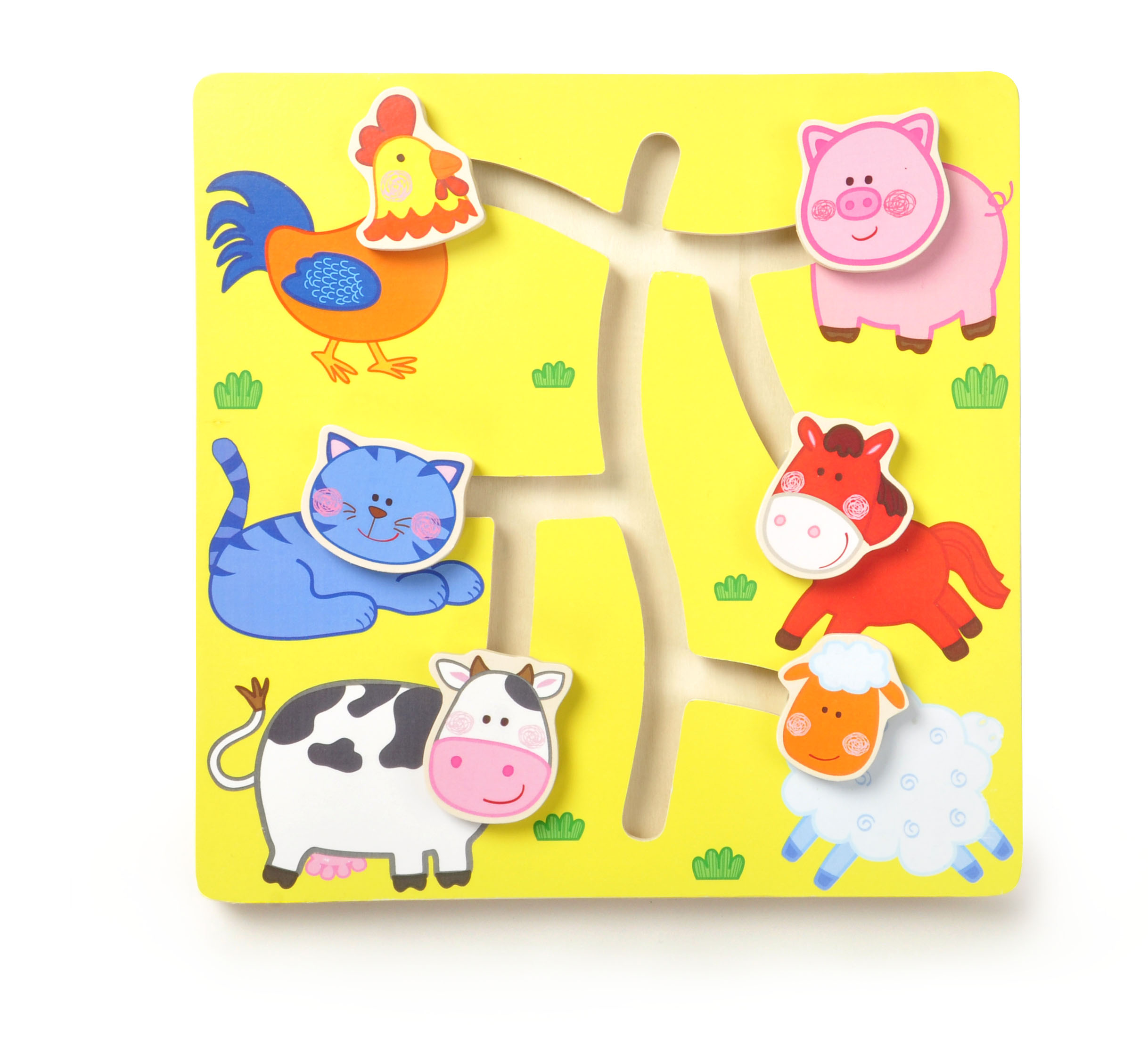 Labirynt drewniany farma. Dziecko dopasowuje główki do odpowiedniego zwierzątka.