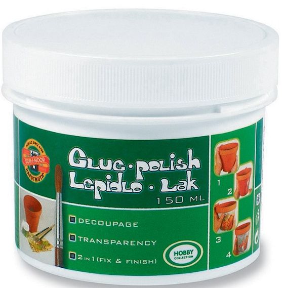Lakier przeznaczony do techniki serwetkowej (decoupage). Można go stosować do róznych powierzchni min. karton, drewno, ceramika, kamień, metal, styropian, glina i wiele innych. Wytwarzany jest na bazie wody. Po wyschnięciu pozostawia przeźroczystą i trwałą powłokę.Użycie:1. Pokryć warstwą lakieru do decoupage dekorowany przedmiot.2. Wycięty motyw należy umieścić na wilgotnym lakierze.3. Po naklejeniu dekoracji nałożyć kolejną warstwę lakieru.