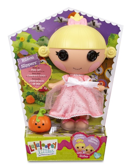 Ribbon Slippers powstała z sukni Kopciuszka. Uwielbia bawić się do północy. Ulubioną rzeczą jest przejść się przez ścieżkę dyniową i szukać największej dyni tak, aby mogła udawać, że to jej królewska karoca i że ona jedzie na bal księżniczek.Naszyta Data:10 maja (Dzień zabawy całonocnej)Lalaloopsy (Lalalupsy) były kiedyś szmacianymi lalkami, które tuż po uszyciu w magiczny sposób ocknęły się do życia. Każda z nich uszyta została ze starego stroju i uzyskała osobowość jego materiału. Lalaloopsy żyją w kolorowym świecie rzeczy. Każda z nich posiada swoje zwierzątko i ulubione przedmioty, a zadaniem jej opiekunki jest dbać o to, aby jej świat pozostał kolorowy i radosny.Lalaloopsy to nowa linia zabawek od MGA, która została zaprojektowana tak, aby propagować idee szacunku dla inności i indywidualności oraz ideę, iż wszystko może dostać drugie życie i nic nie powinno się marnować. Laleczki Lalaloopsy uczą dzieci, że każdy człowiek, tak jak one, jest na swój sposób wyjątkowy i ta wyjątkowość jest ogromnym skarbem, który należy szanować i pielęgnować. Lalaloopsy, dzięki osobowości i atrybutom, pobudzają wyobraźnię i inwencję twórczą dzieci.Marka Lalaloopsy osiągnęła już ogromny sukces w USA i Wielkiej Brytanii, a teraz zawitała do Polski.Lalki Lalaloopsy:- każda ma swój indywidualny charakter- w zestawie z laleczką jest jej zwierzątko- można poruszać głową, rękoma i nogami lalki- można zdejmować/zmieniać ubranka, buty- idealne aby stworzyć kolekcjęW zestawie:- Lalka- Zwierzątko- Plakat
