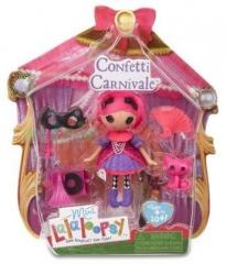 Konfetka ma ubranko uszyte z sukni z balu maskowego. Uwielbia bawić się na przyjęciach i późno kładzie się spać. Choć często ukrywa się za maską karnawałową, to jej przyjaciele zawsze ją rozpoznają. Ukochanym pupilkiem Confetti jest kotek. Lalka została uszyta 21 września - w Dniu Przebierania. Zestaw zawiera lalkę i pupilka.Lalaloopsy to urocze, kolekcjonerskie lalki i mini laleczki, wzorowane na lalkach - szmaciankach. Każda laleczka posiada swoją wyjątkową, niepowtarzalną osobowość, która kształtuje się w procesie tworzenia, a na jej ostateczny wizerunek ma wpływ tkanina, z której powstaje i dzień jej urodzin.Lalaloopsy żyją w kapryśnym świecie, pełnym śmiesznych i zaskakujących zdarzeń. Wystarczy odrobina dziecięcej wyobraźni i miłości, by magiczny świat Lalaloopsy trwał bez końca!Lalaloopsy mają oczy z guzików, uśmiechnięte, ""fastrygowane"" buźki, urocze, wielobarwne stroje. Zapakowane są w śliczne, ozdobne pudełeczka. Każdej laleczce towarzyszy zabawny kompan ukochany pupilek.