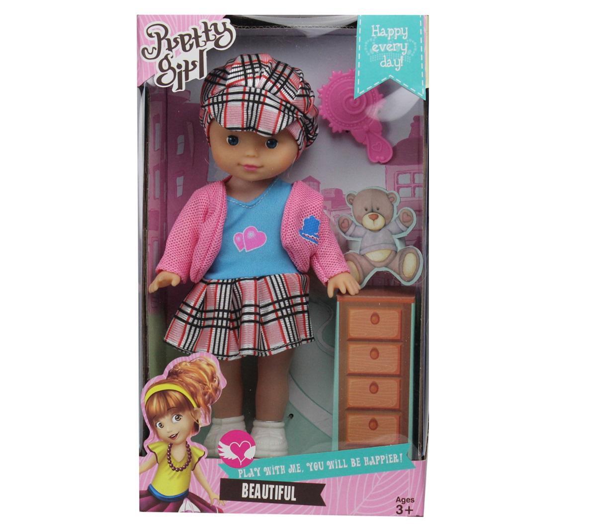 Laleczka w ubranku z mebelkiem i akcesoriami.